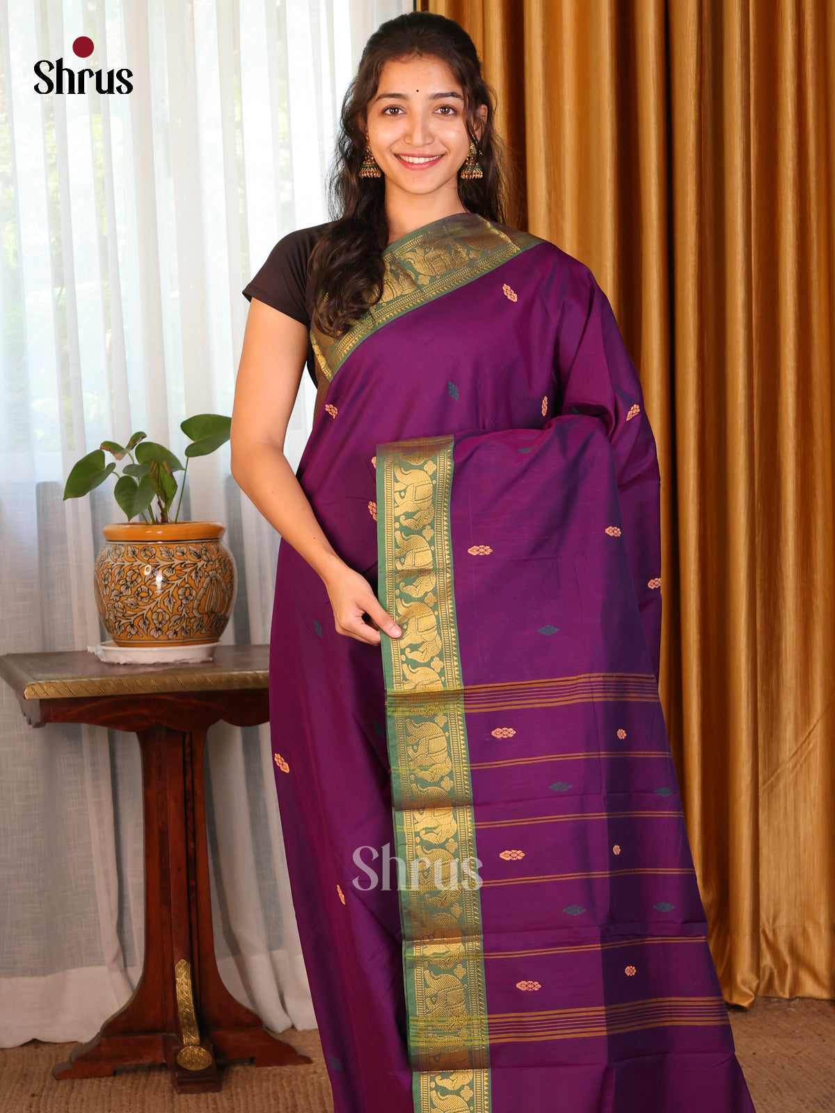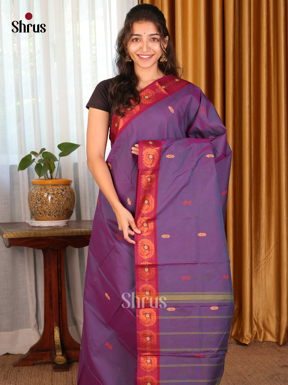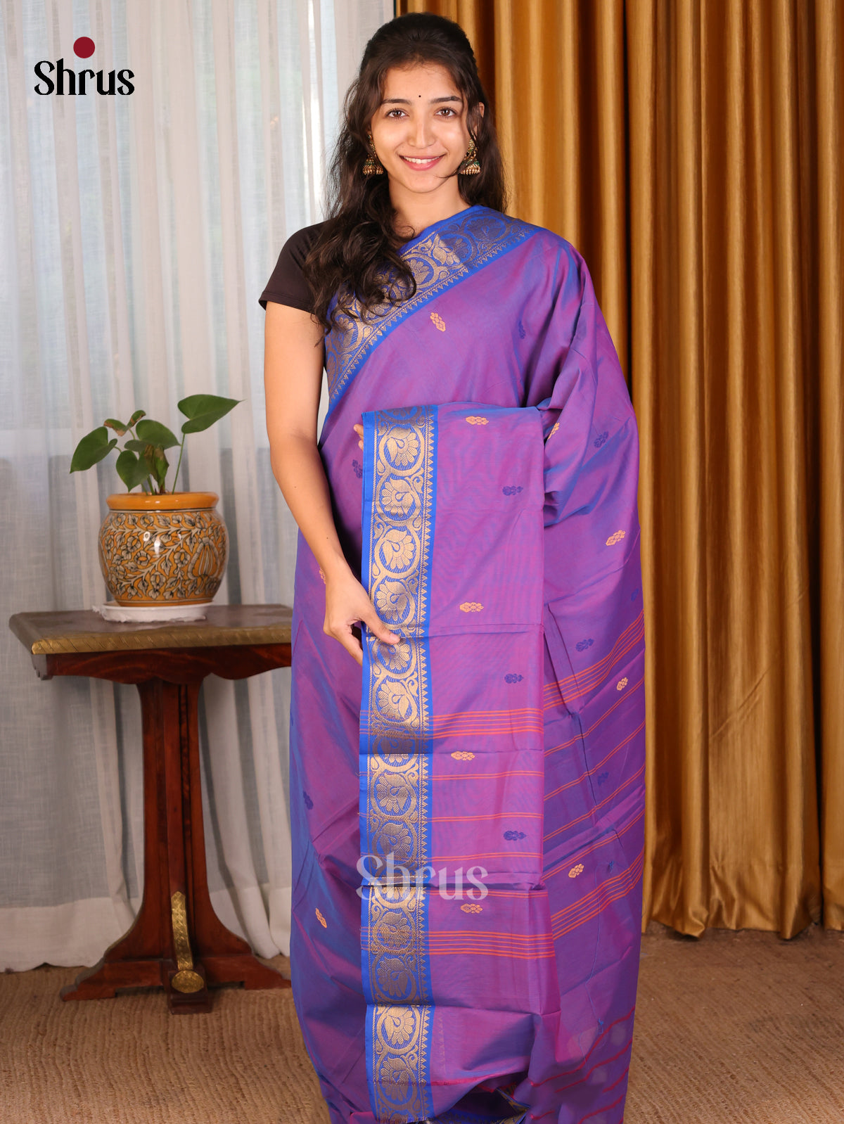 Violet & Brown- Chettinad Mix Cotton-Without Blouse Saree