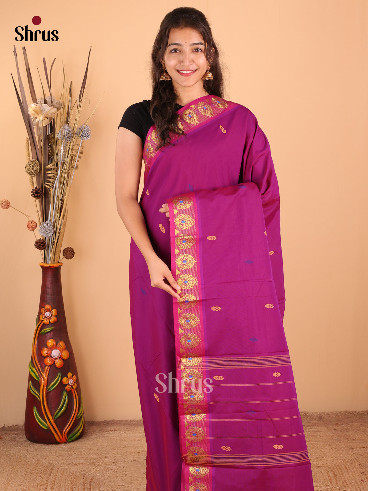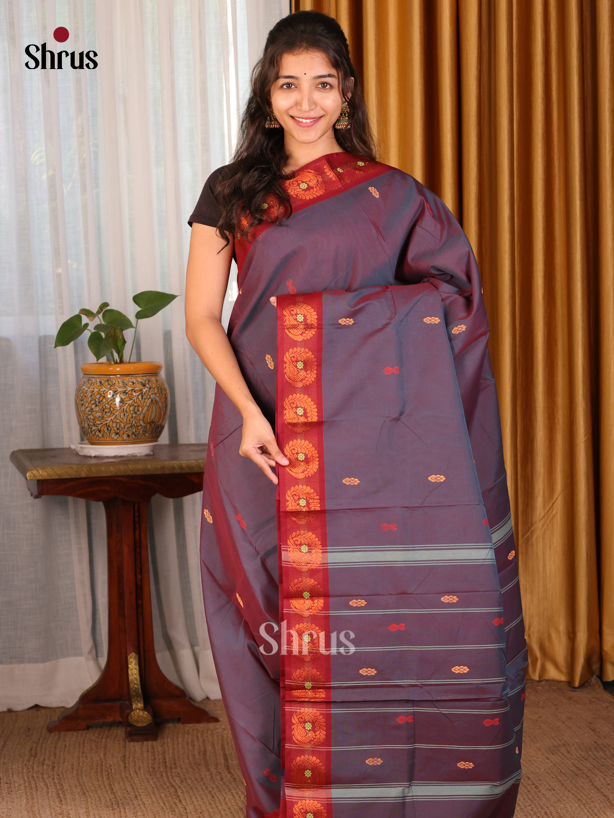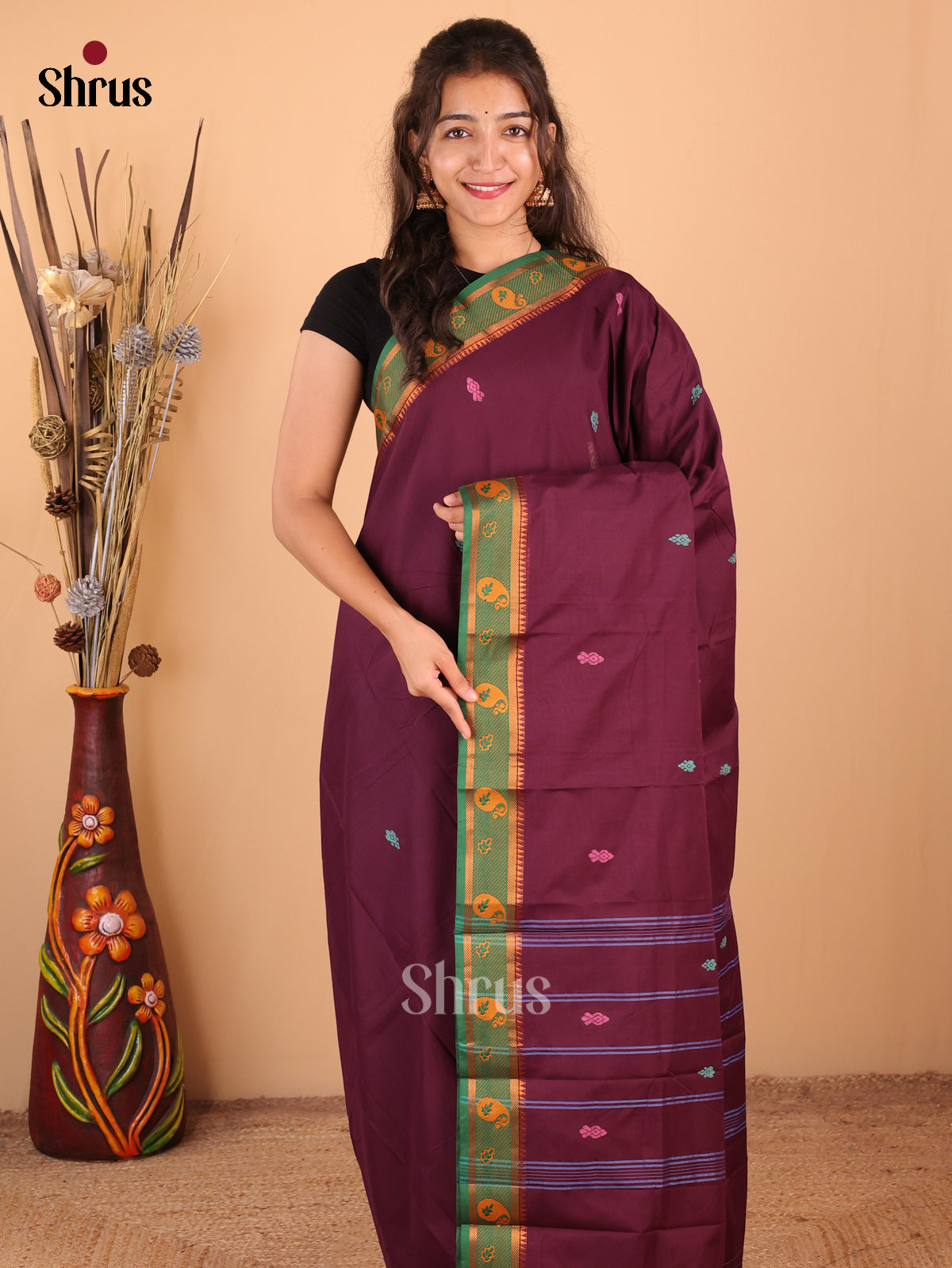 Violet & Brown- Chettinad Mix Cotton-Without Blouse Saree
