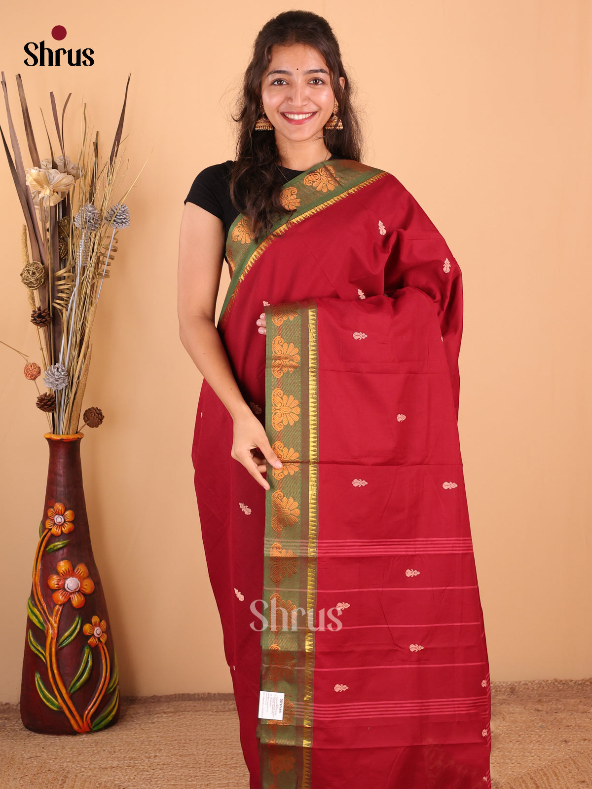 Maroon & Green- Chettinad Mix Cotton-Without Blouse Saree