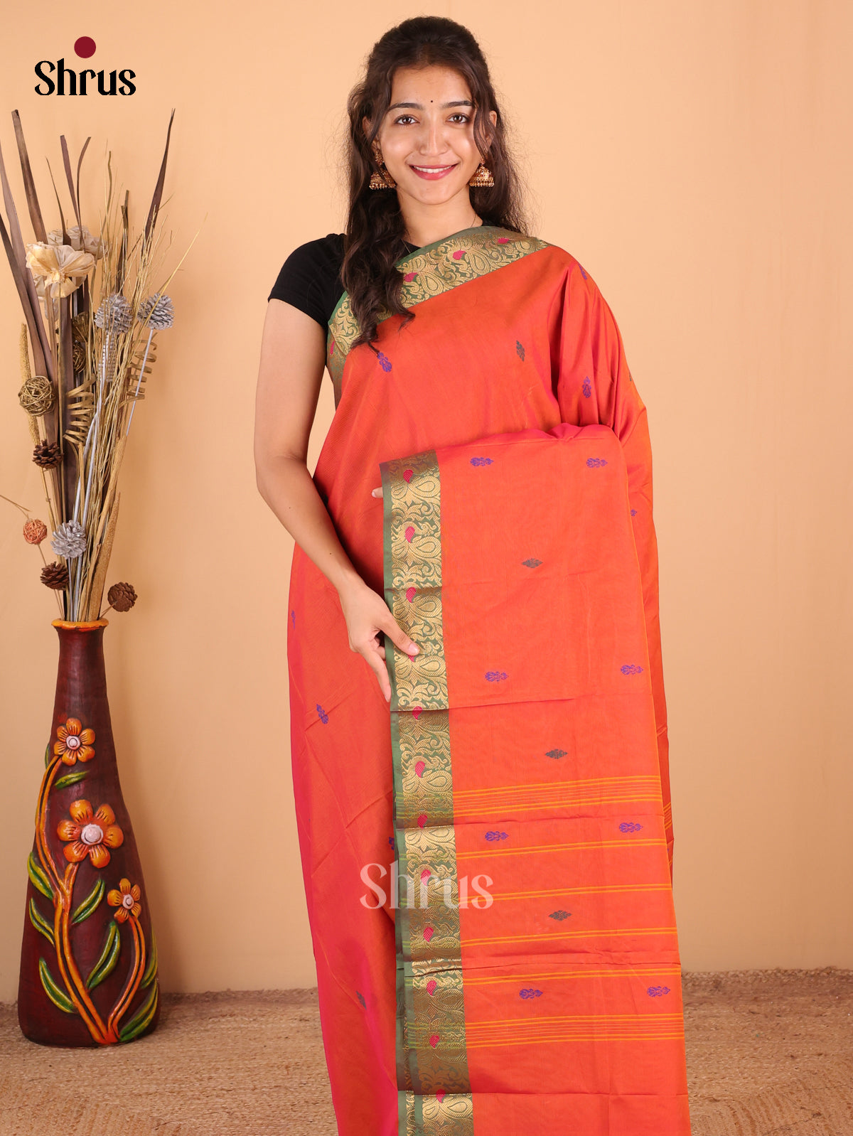 Orange & Red - Chettinad Mix Cotton-Without Blouse Saree