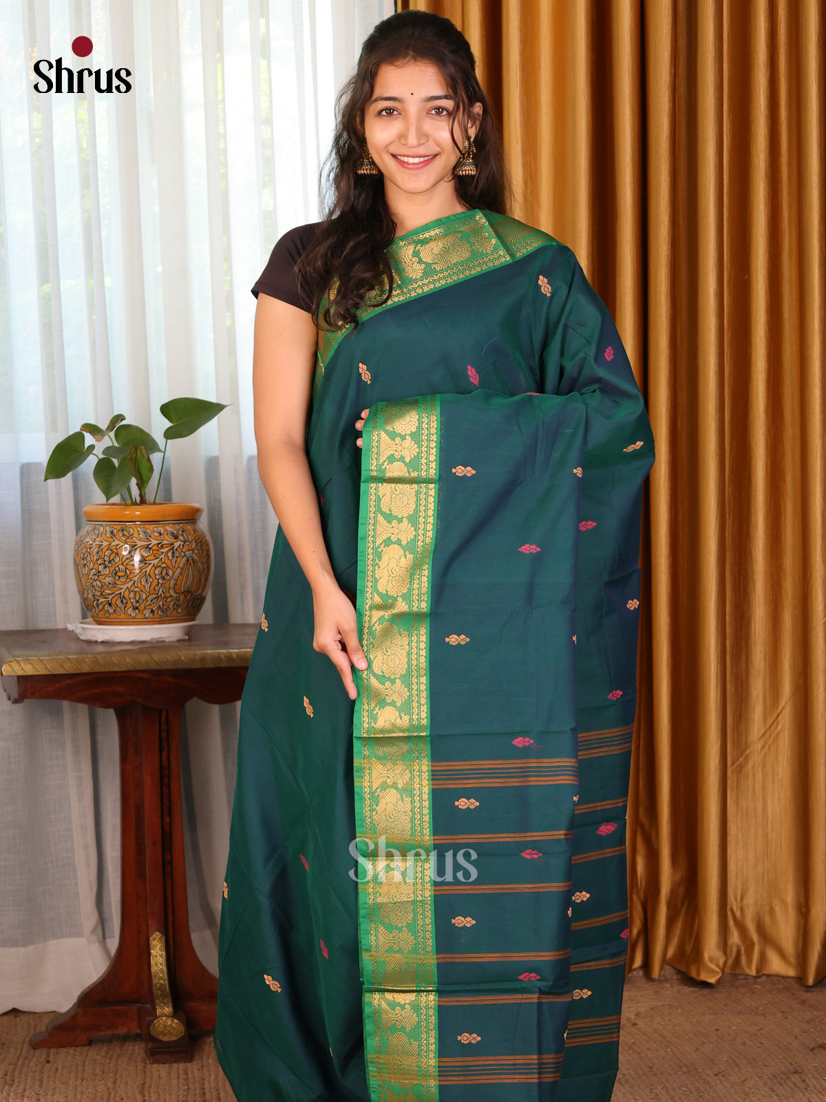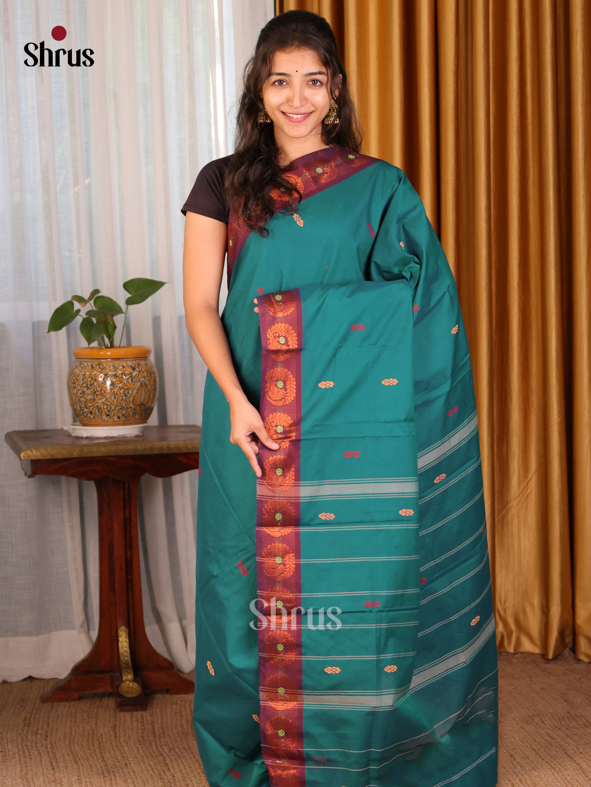 teal Green & Maroon - Chettinad Mix Cotton-Without Blouse Saree