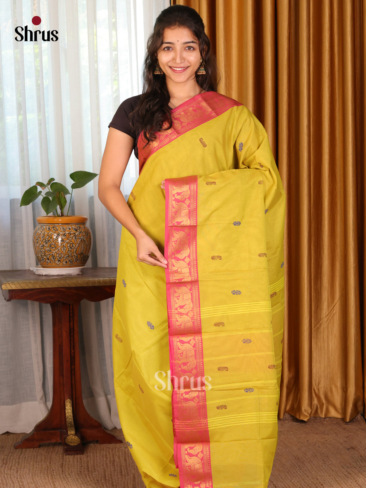 Mustard & Pink - Chettinad Mix Cotton-Without Blouse Saree