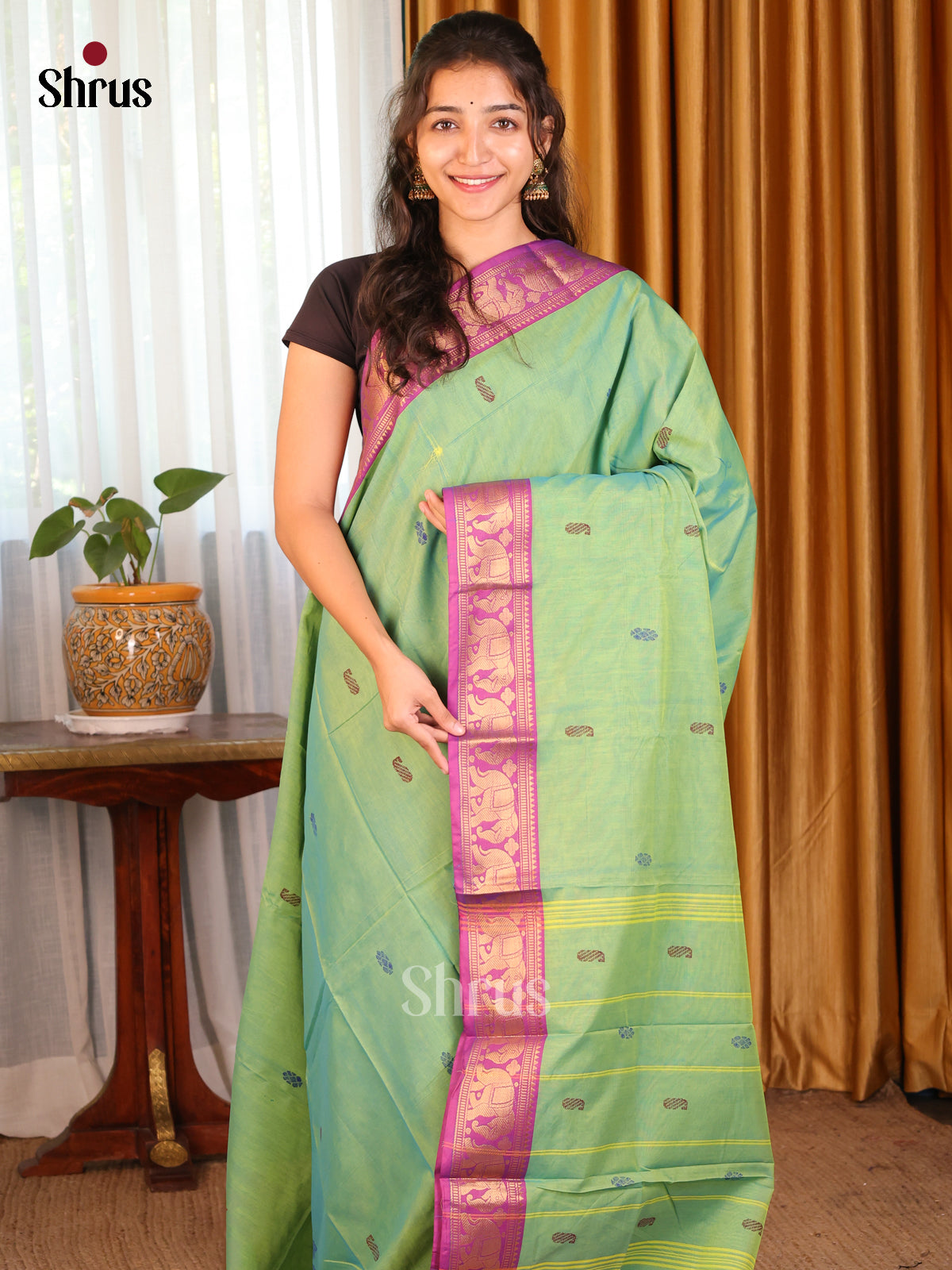 Mustard & Green - Chettinad Mix Cotton-Without Blouse Saree