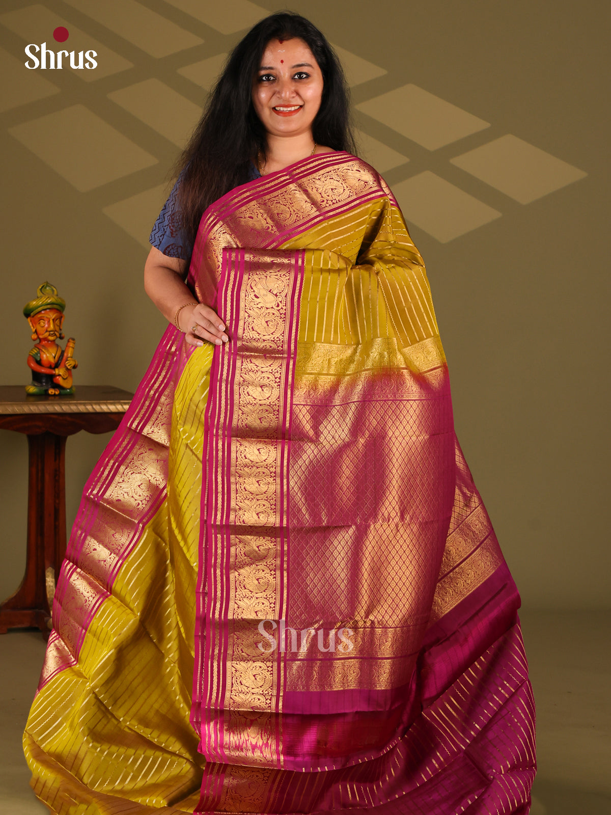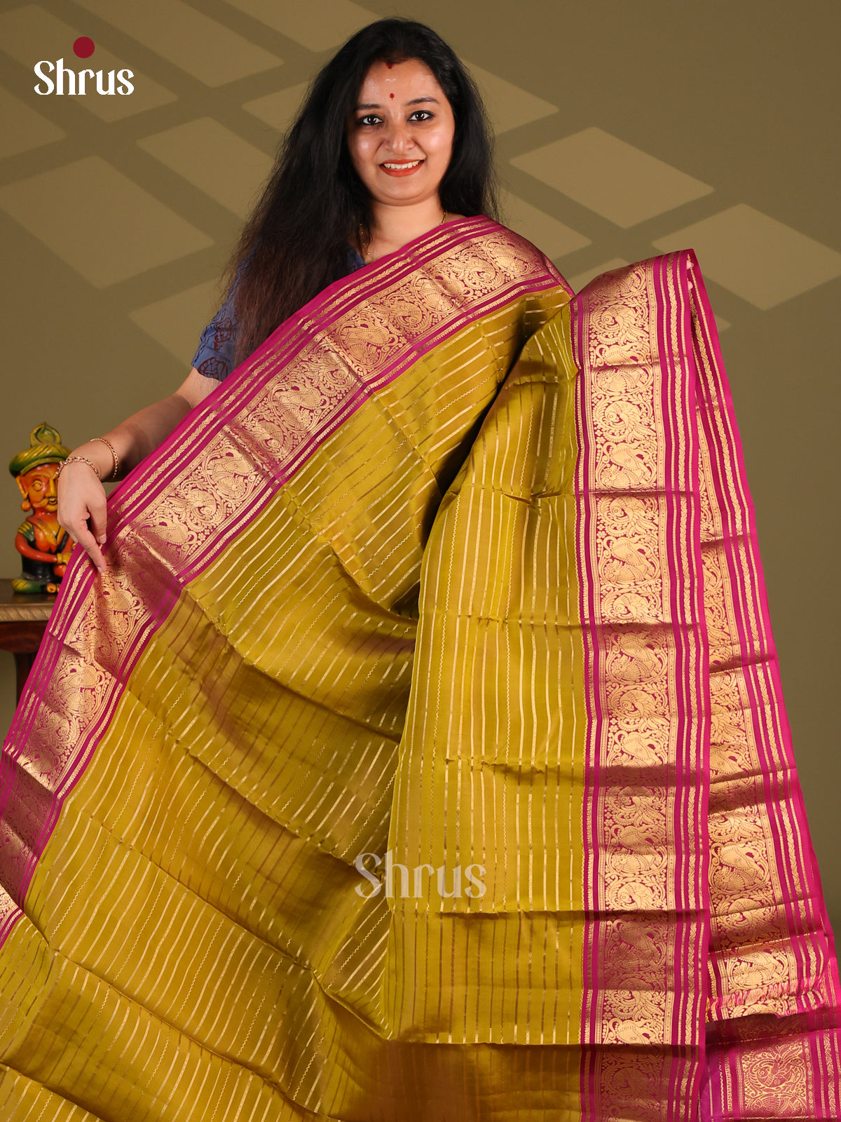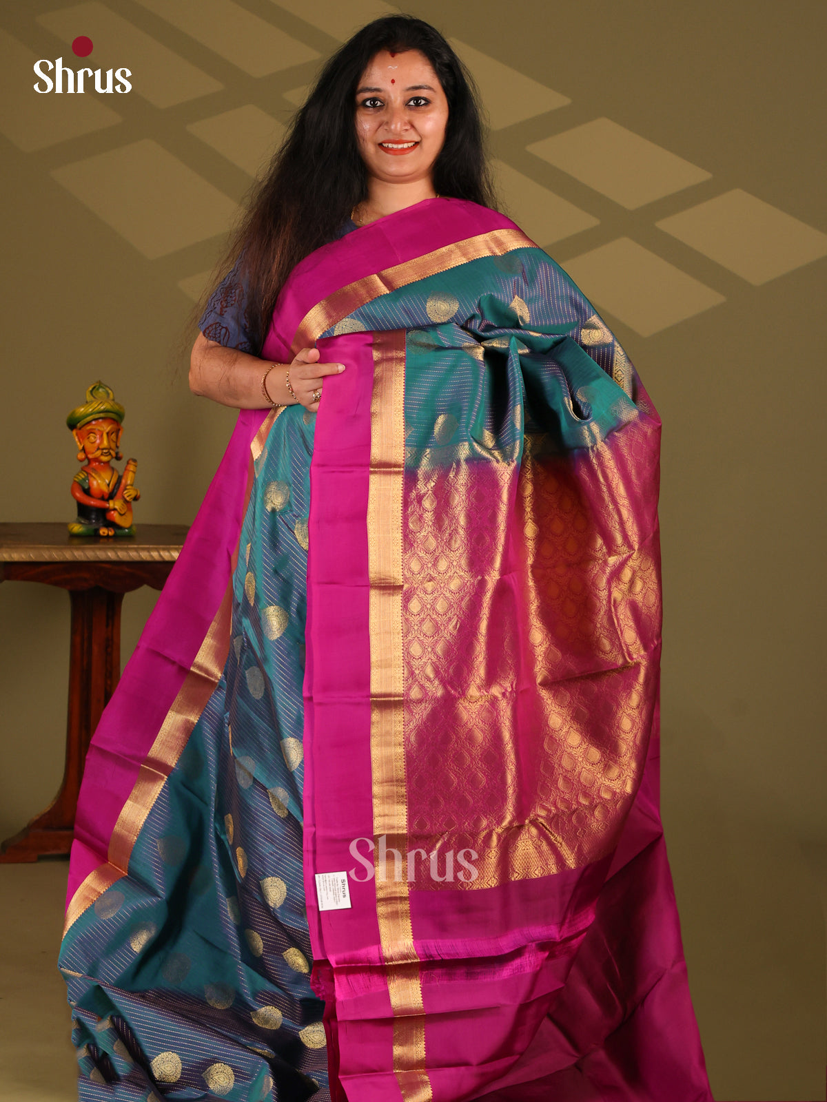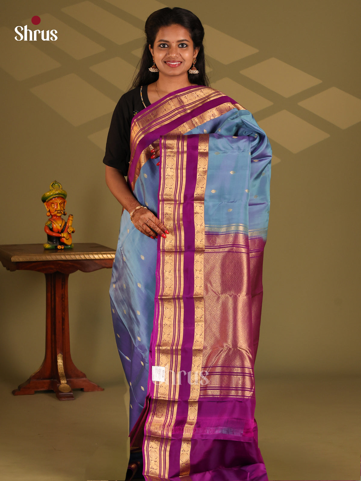 Golden brown & blue - Kanchipuram-halfpure Saree