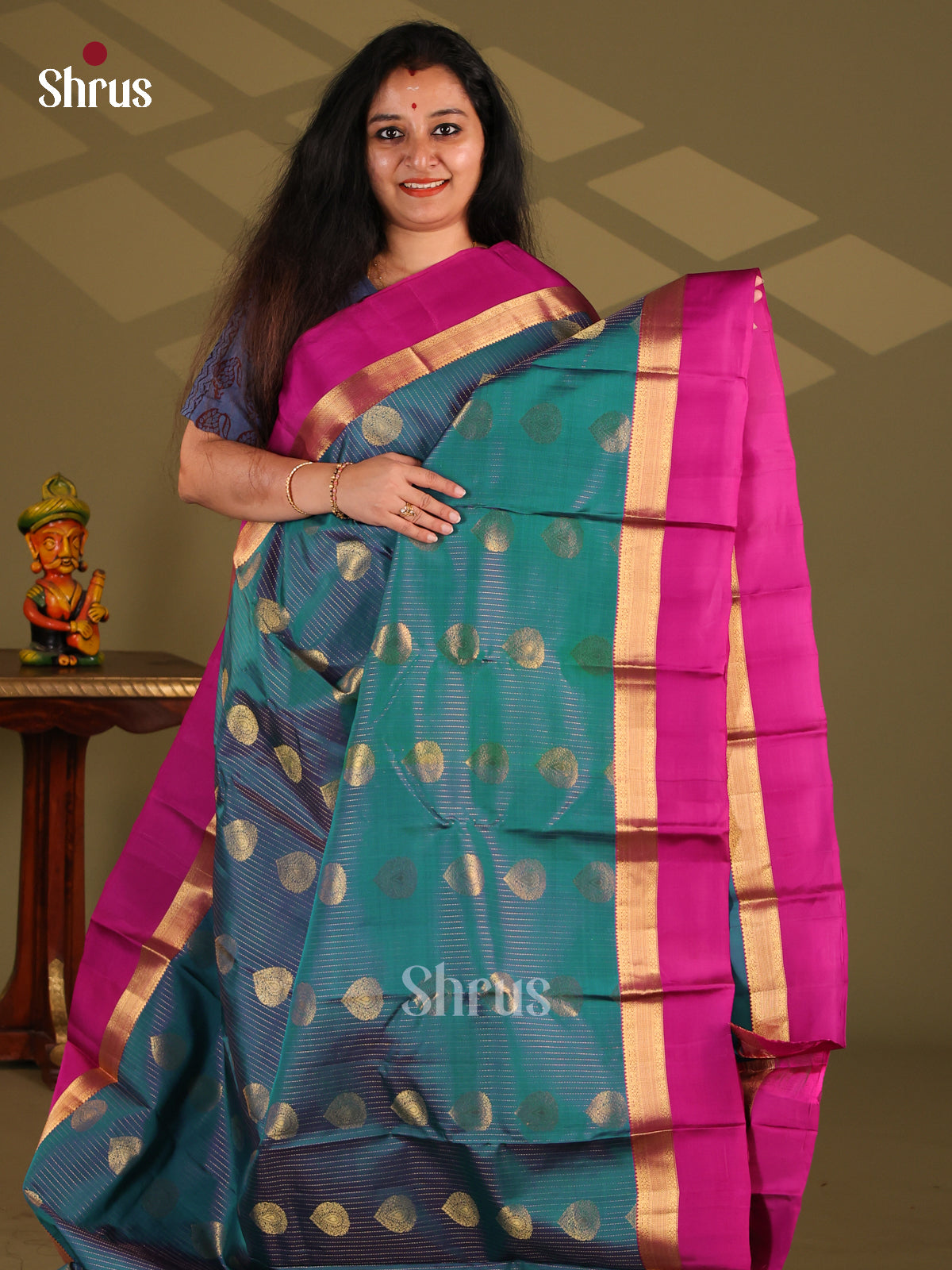 Teal Green & Purple - Kanchipuram-halfpure Saree