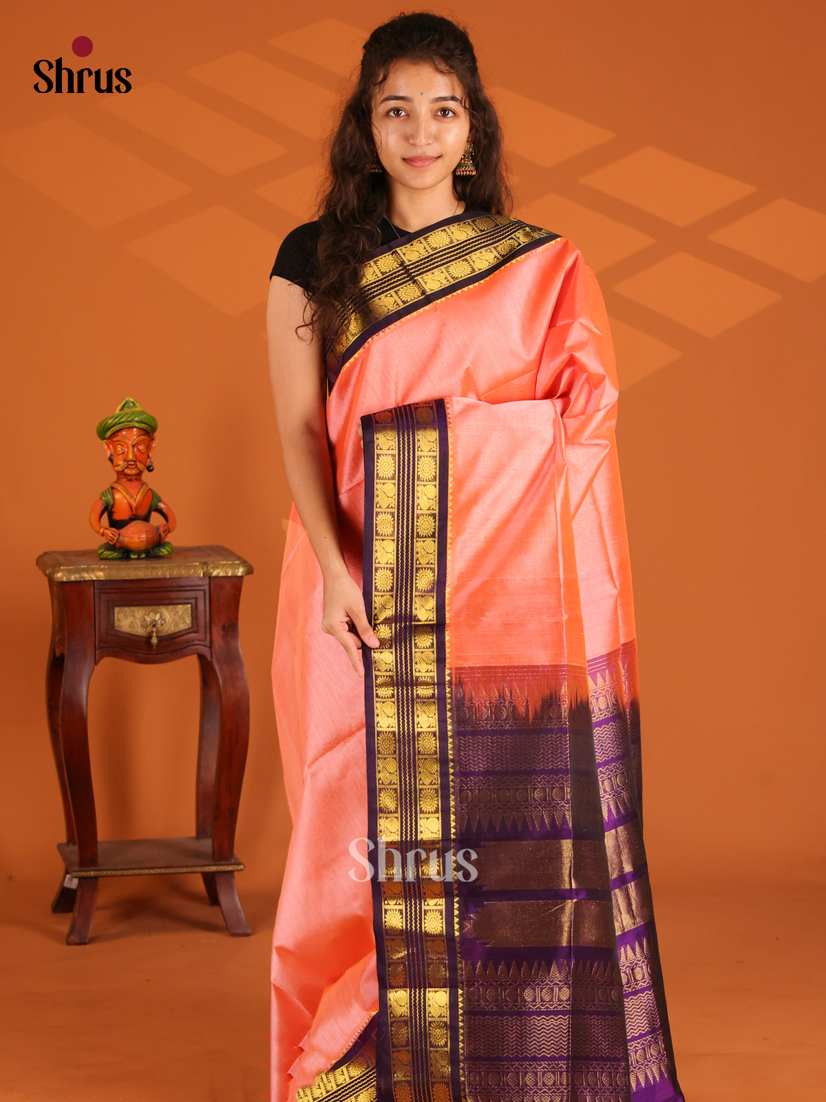 Radiant Orange Silk Cotton Korvai border Saree gleams with zari buttas