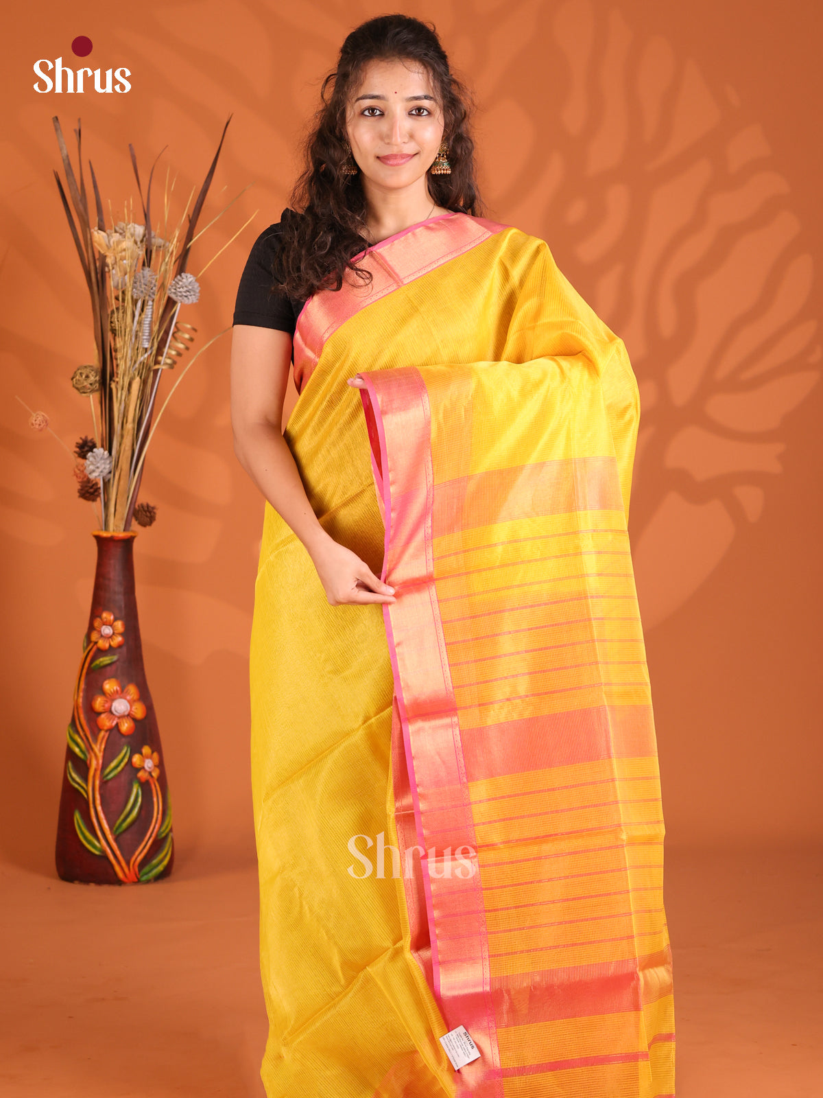 Glorious Yellow & Pink Maheshwari silkcotton Saree with thread woven buttas & zari border