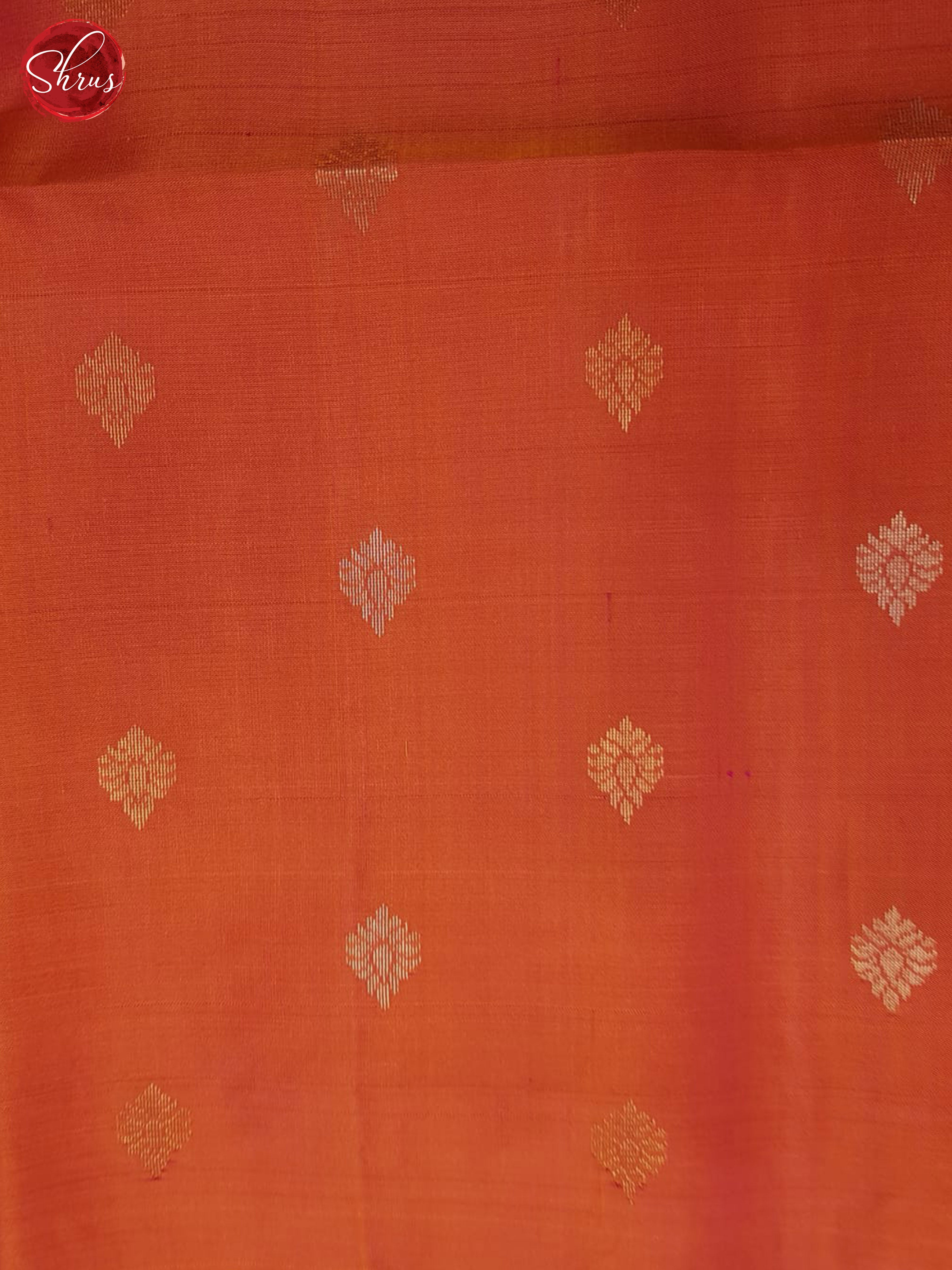 Elegant Double shaded greenish brown Soft Silk Saree dazzle with gold,silver zari woven triangle motifs on the body . The delightful weave is beautifully complemented with a Orange Border and art Zari woven pallu with brocade in it . The rich orange plain Blouse is a perfect finish.