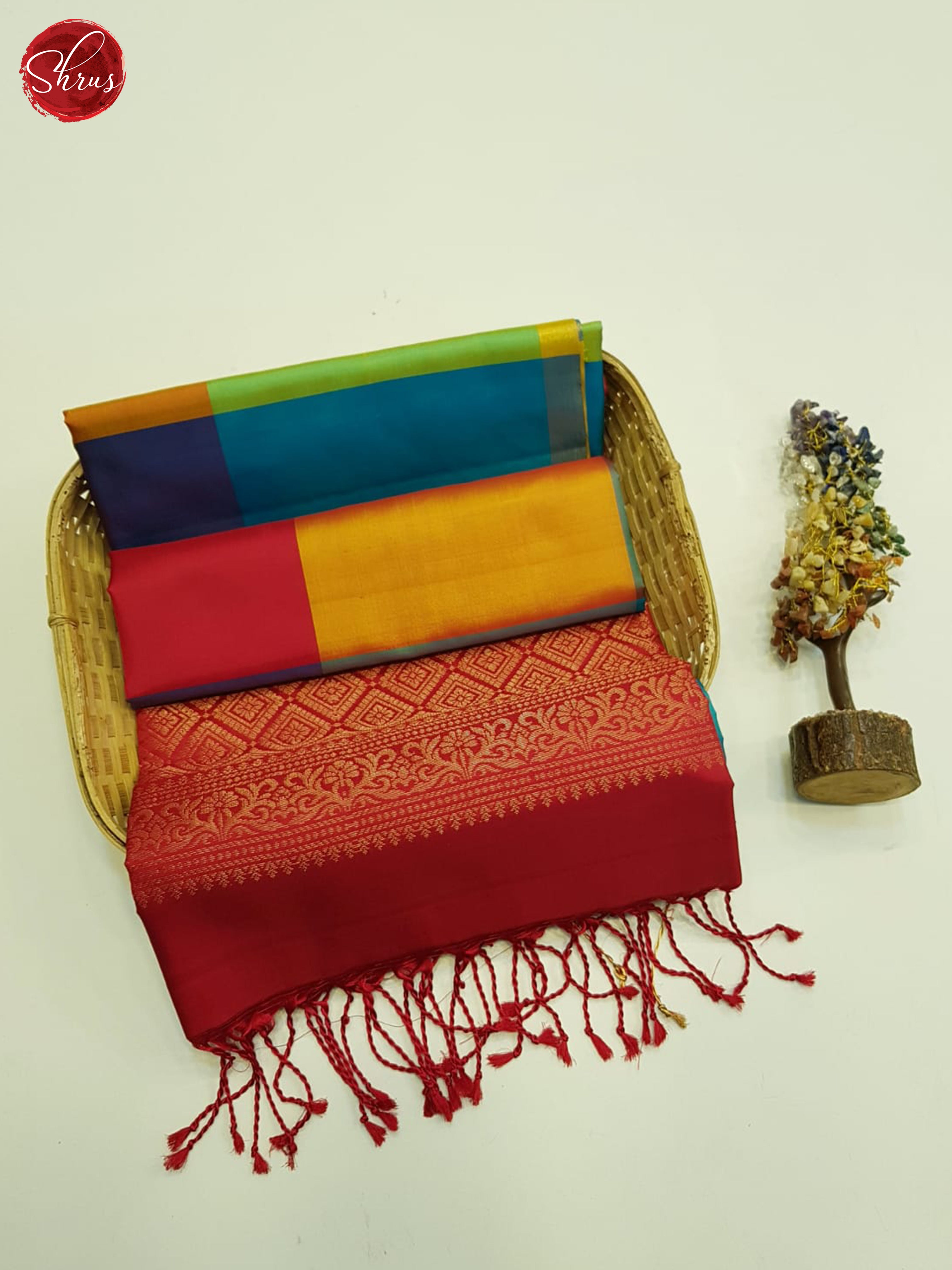 Pretty multi color checks Soft Silk Saree dazzle with gold zari woven motiifs on the body . The delightful weave is beautifully complemented with a contrast Red Zari woven pallu with brocade in it . The plain red Blouse with thin zari border is a perfect finish