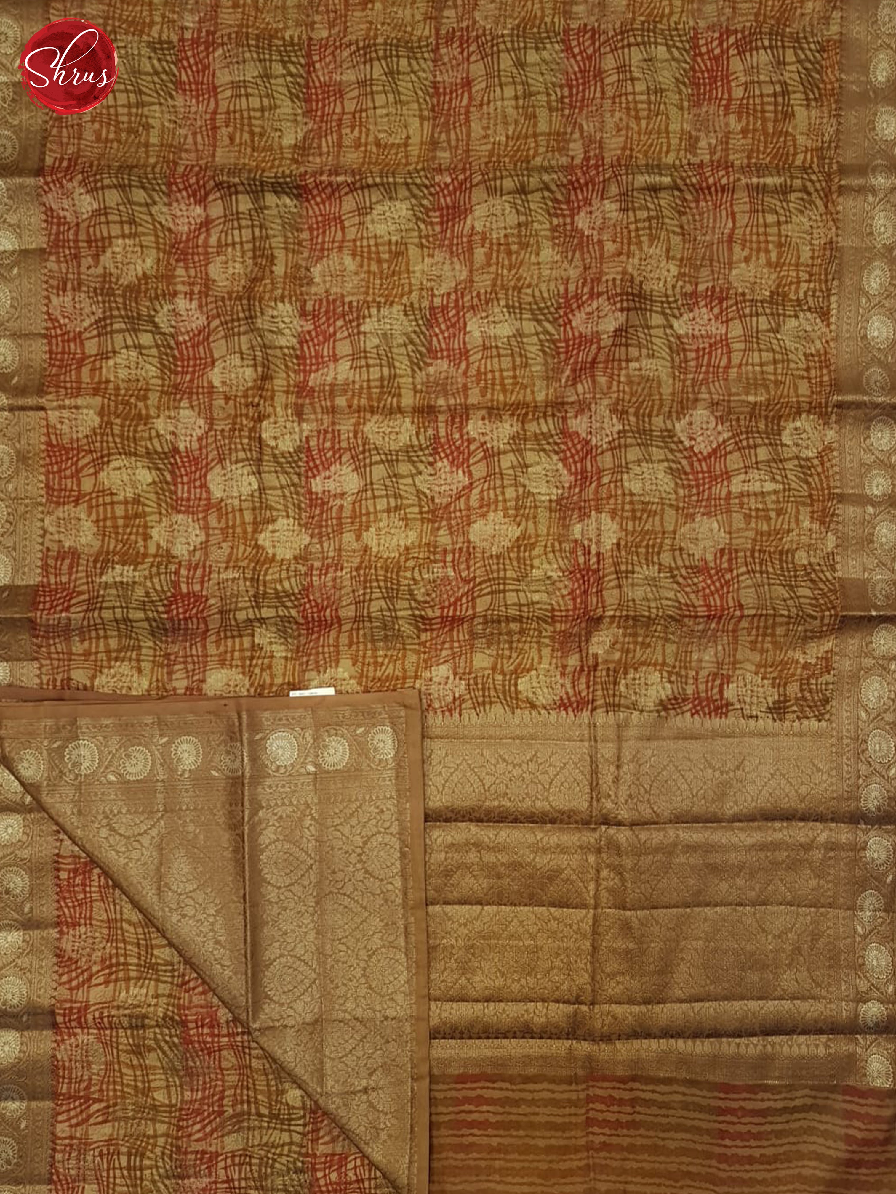 Beautiful Beige Chanderi saree enchants with abstract print on the body .The rich brown zari woven Border & art printed Pallu adds elegance . Attached with zari brocade brown blouse with zari border completes The ensemble