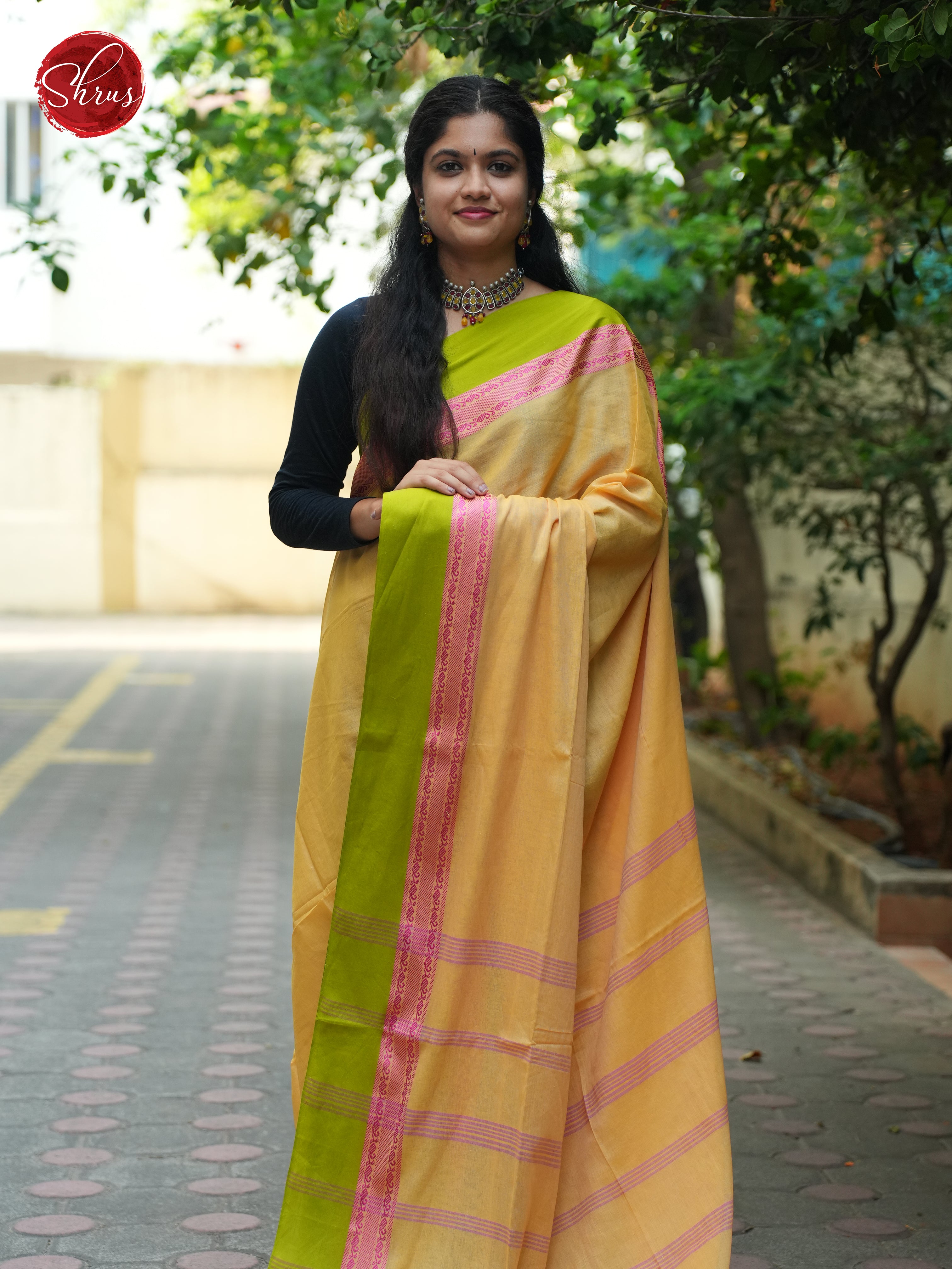 Pretty Sandal Bengal cotton saree showcases a lovely Plain body, bordered with a striking Green The refined self pallu has a striped design and is paired with a simple self blouse with a border.