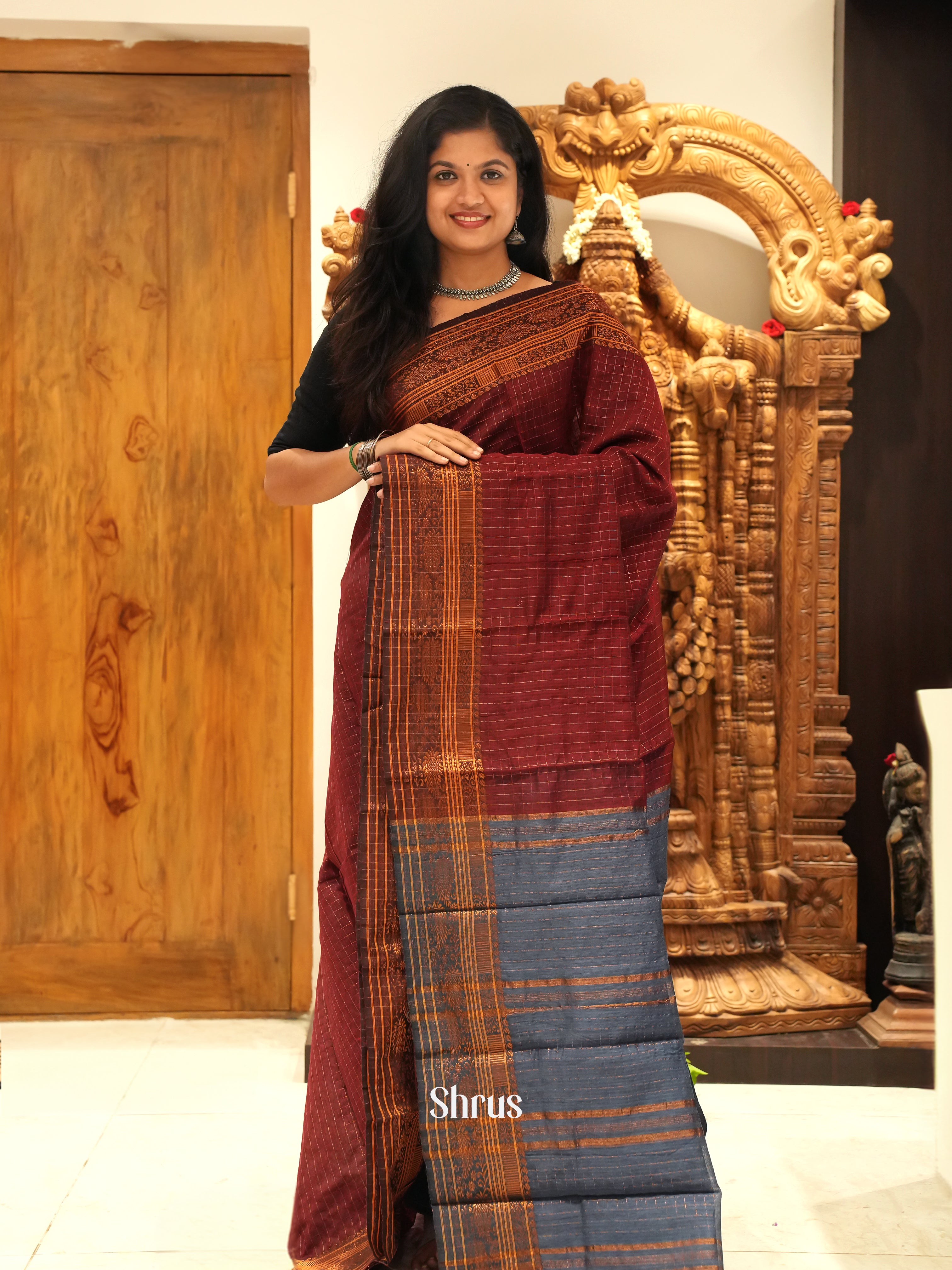 Beautiful Brown Mercerized Cotton saree boasts a beautifully hand-woven design with zari woven checks on the body. The contrast zari woven border and Grey striped pallu provide an elegant touch. It also includes a matching Grey Checked Blouse with border