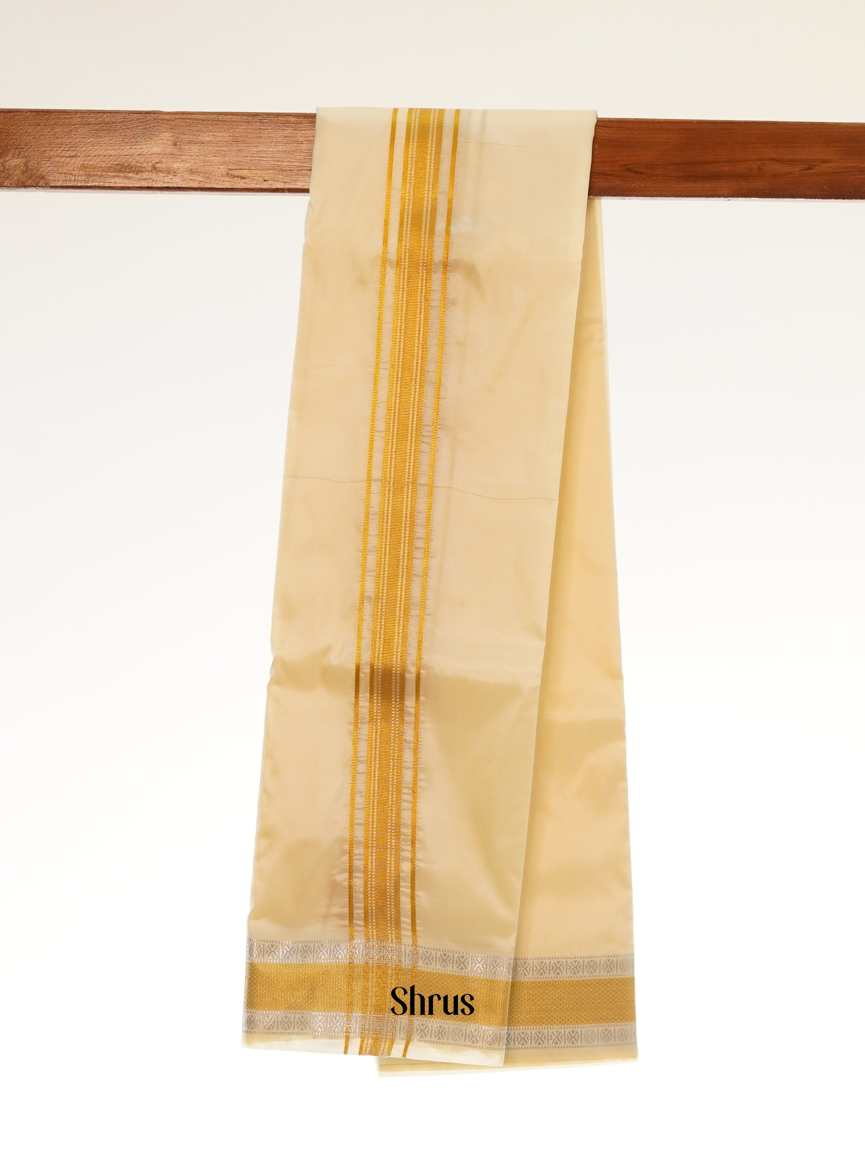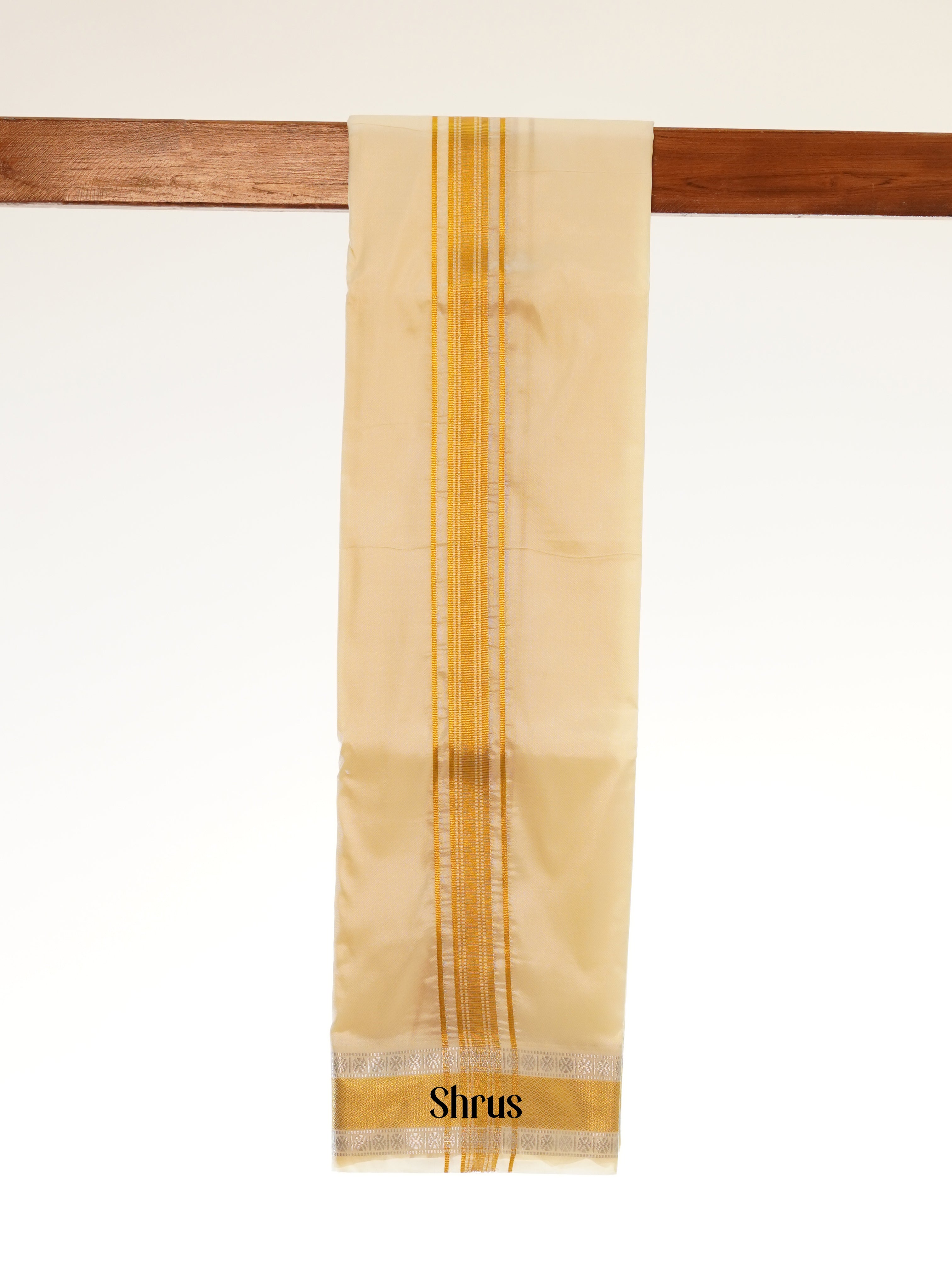 Exquisite Cream dhotis feature intricate gold zari borders, exuding a sense of timeless sophistication. Complemented by an Angavastram, each dhoti is crafted from top-quality materials for unparalleled durability and long-lasting style. Perfect for any occasion, these traditional dhotis offer both comfort and elegance.