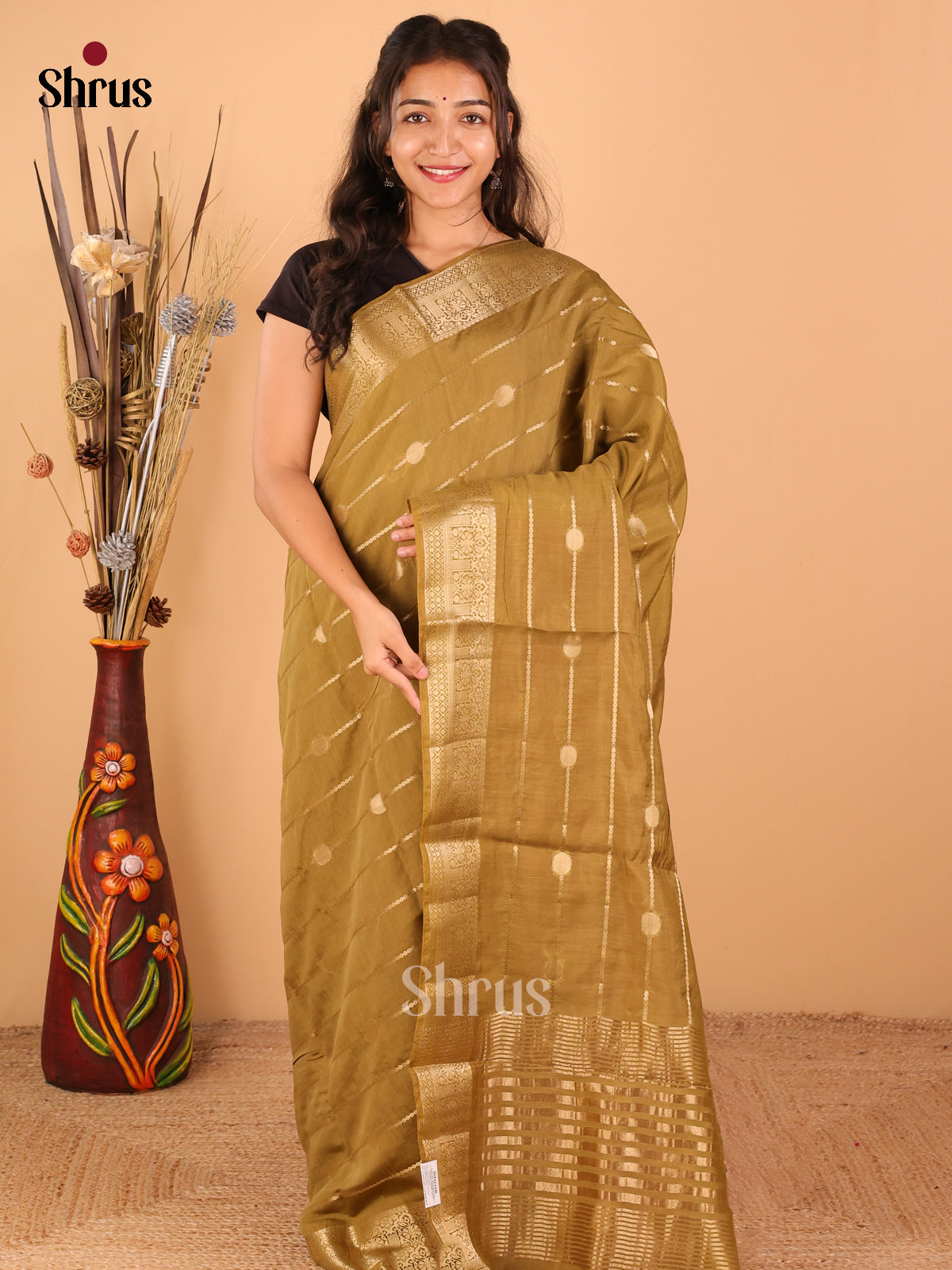 Mehandi green with Brown - Semi Chanderi - CJS03090
