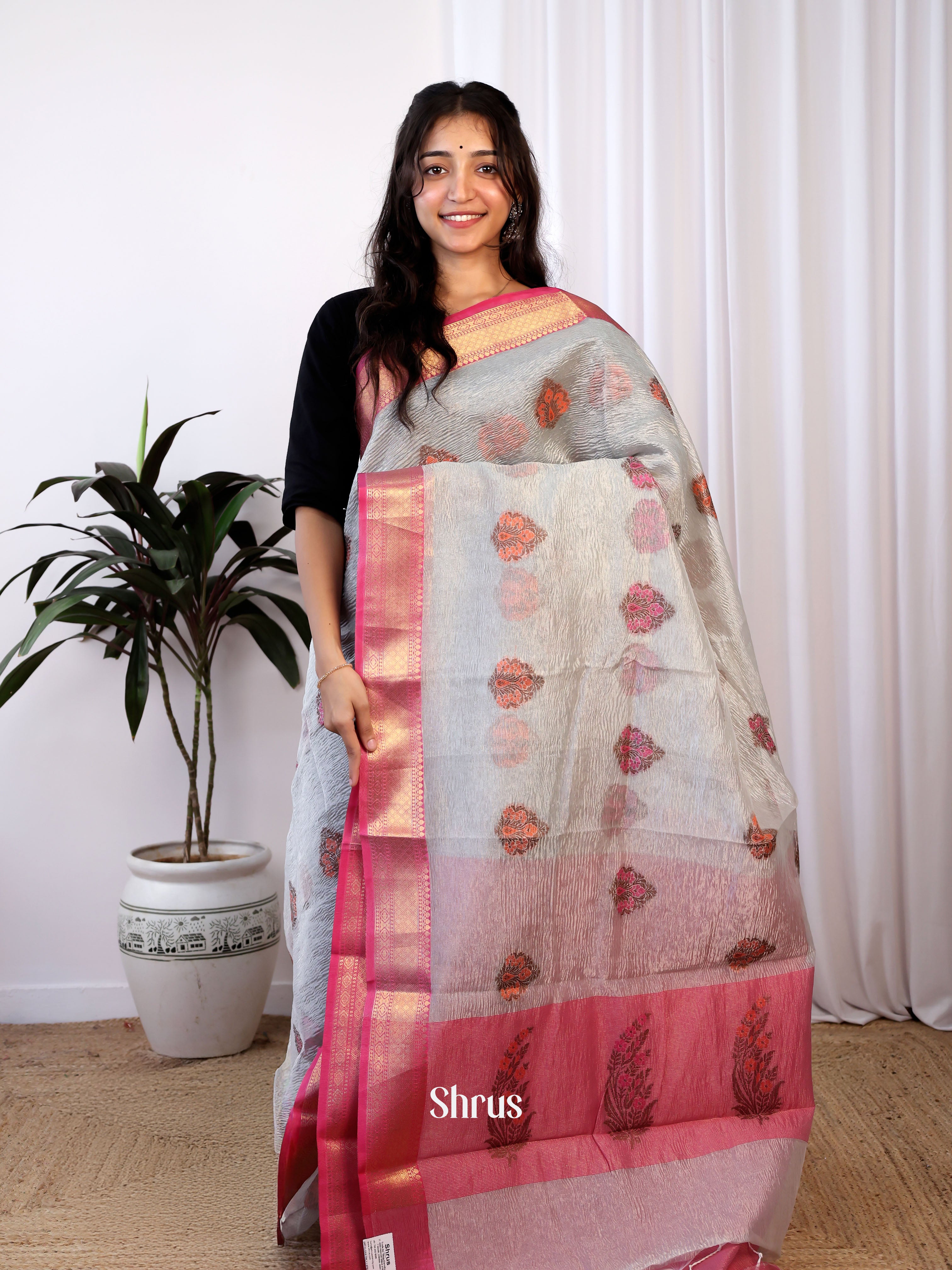Elegant Grey Bamboo Silk Saree boasts an intricate floral motifs on the body. The contrast Pink zari border and Pallu add a charming touch. An attached self printed blouse with border completes the ensemble..