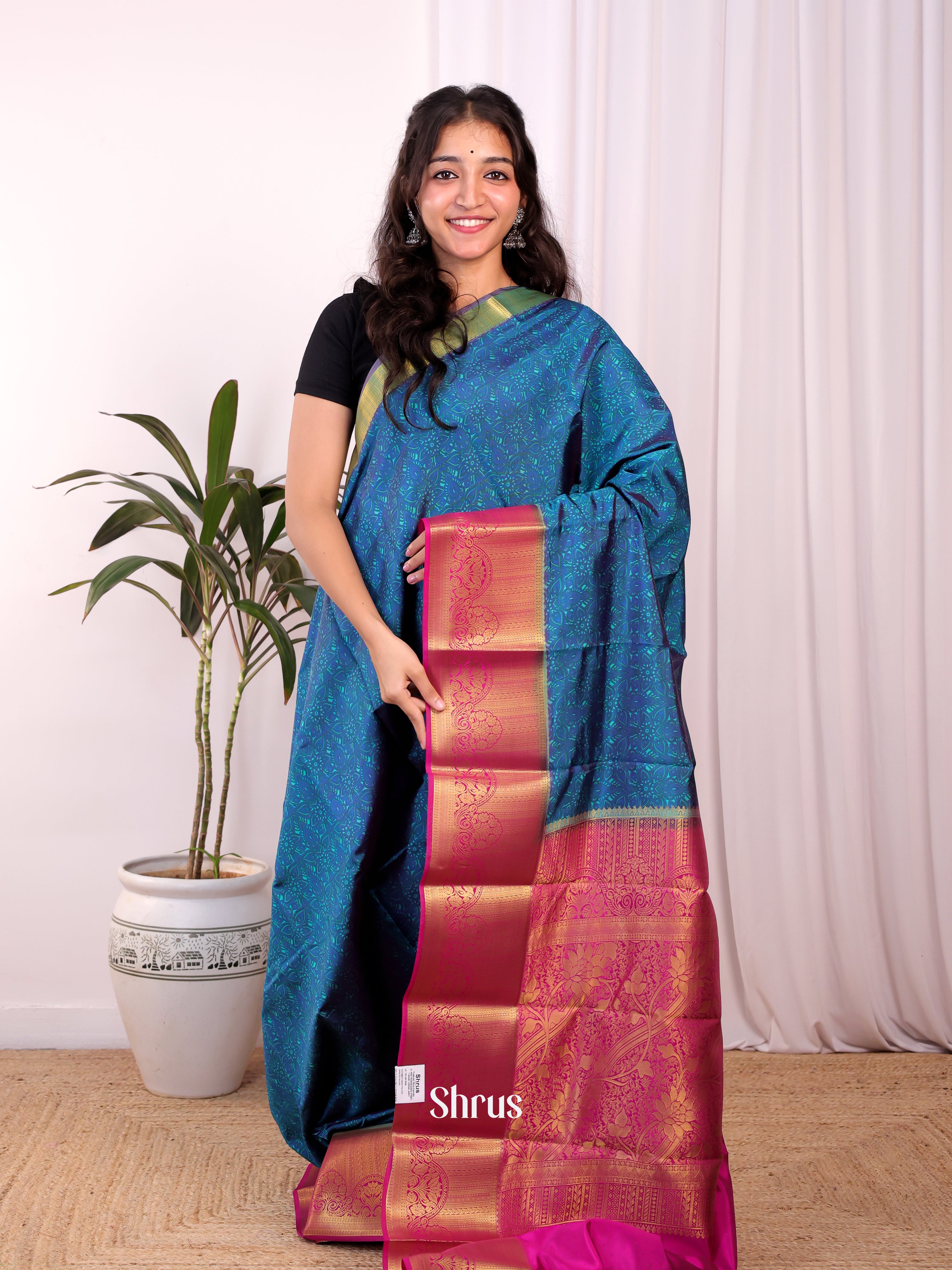Pretty Blue Printed Silk Saree featuring a floral print on the body, this saree adds a touch of elegance to any occasion. The stunning contrast Majenta Kanchi style zari woven border and brocade pallu, along with the simple matching blouse with border, complete the exquisite ensemble.