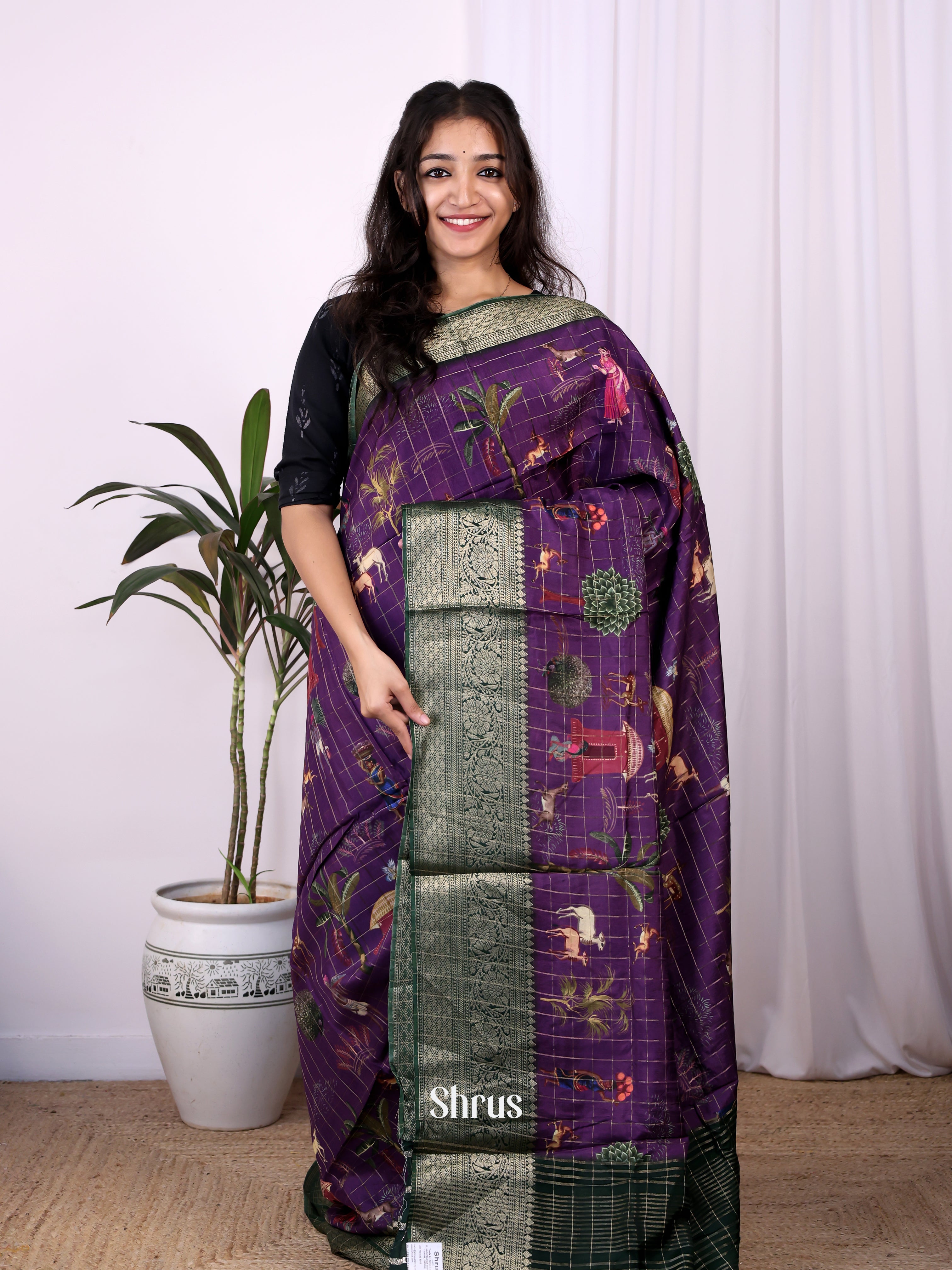 Elegant Violet Semi Dola silk Saree features exquisite floral prints, zari checks and is highlighted by a contrast Green zari border. The contrast printed pallu adds an elegant touch, while the matching blouse gives a fashionable twist to this magnificent garment