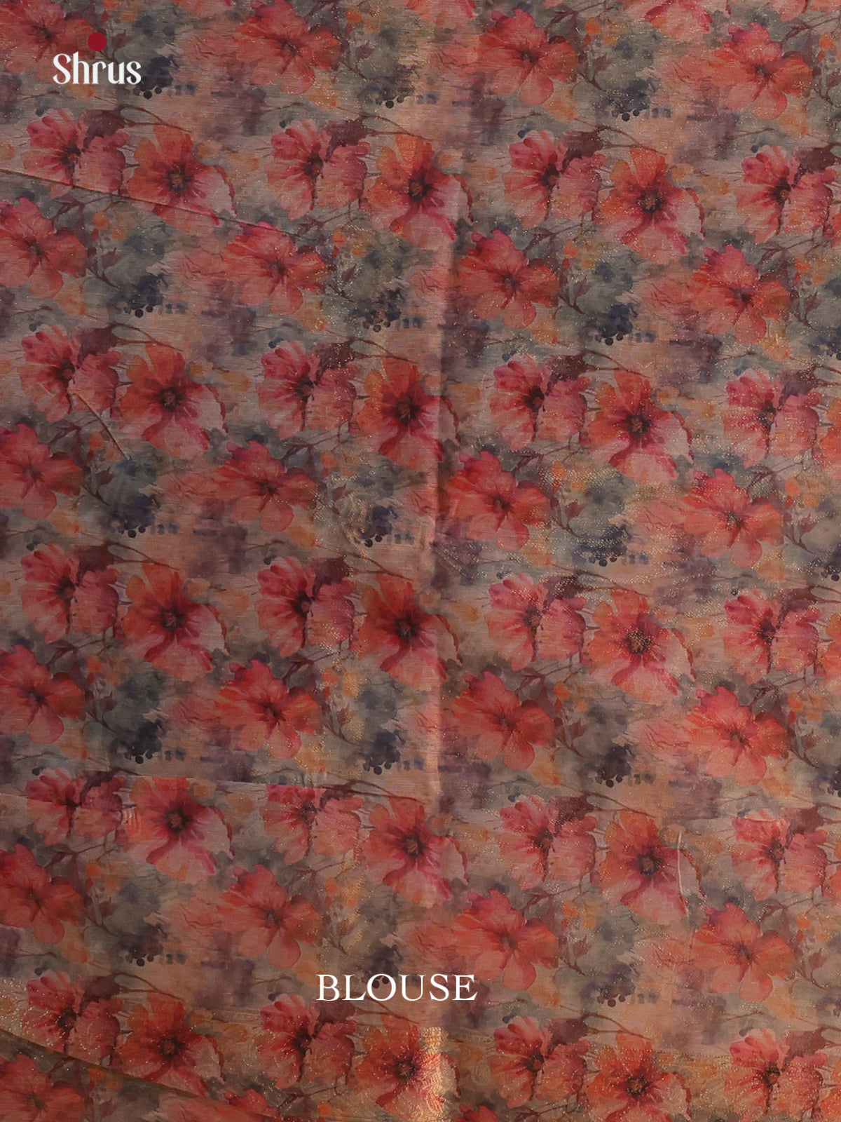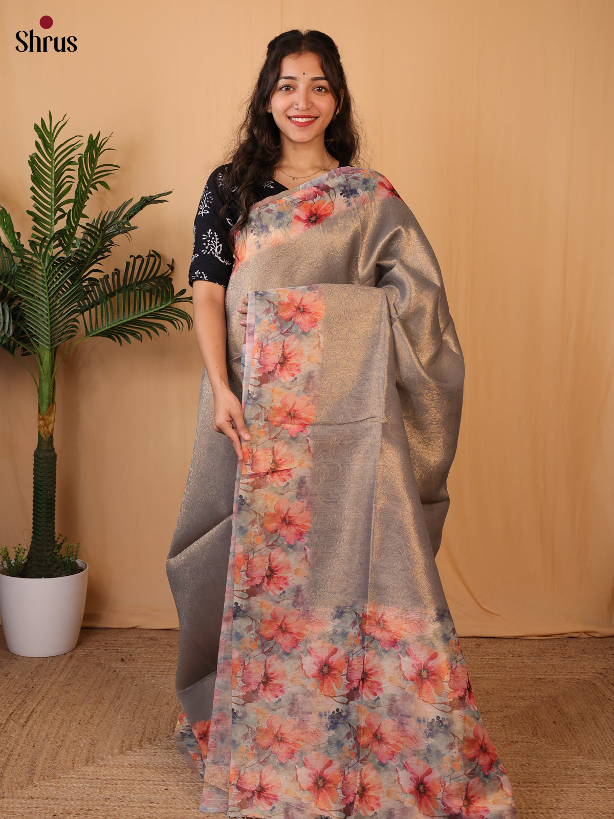 A Beautiful Bluish Grey Semi Tissue Saree features zari woven body, accented with a floral printed border. The saree is accompanied by a floral printed pallu and a matching blouse to complete the elegant look.