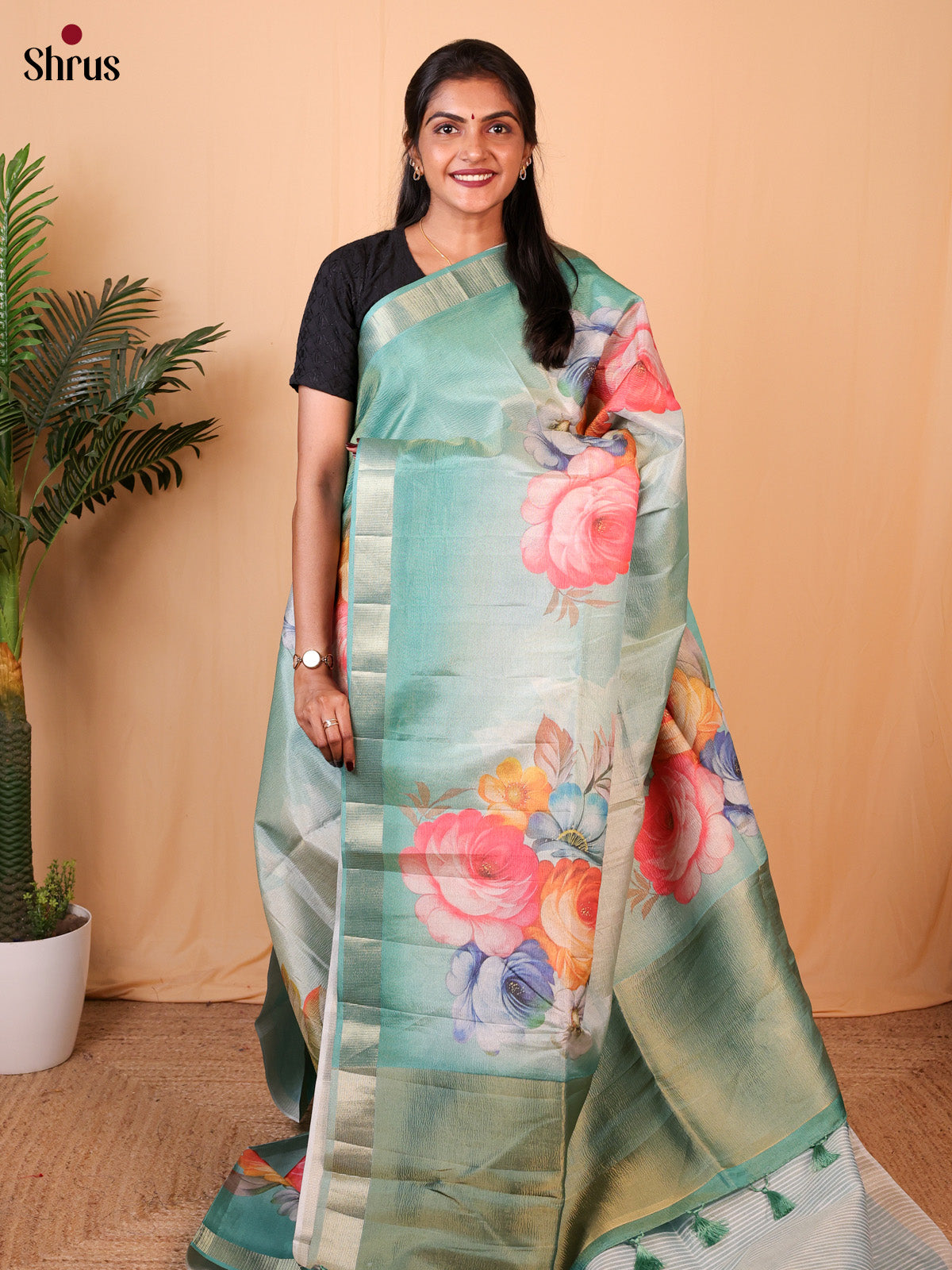 Elegant Green Bamboo Silk Saree enchants with digital floral print on the body. The self zari border and Pallu add a charming touch. An attached self printed blouse with border completes the ensemble..