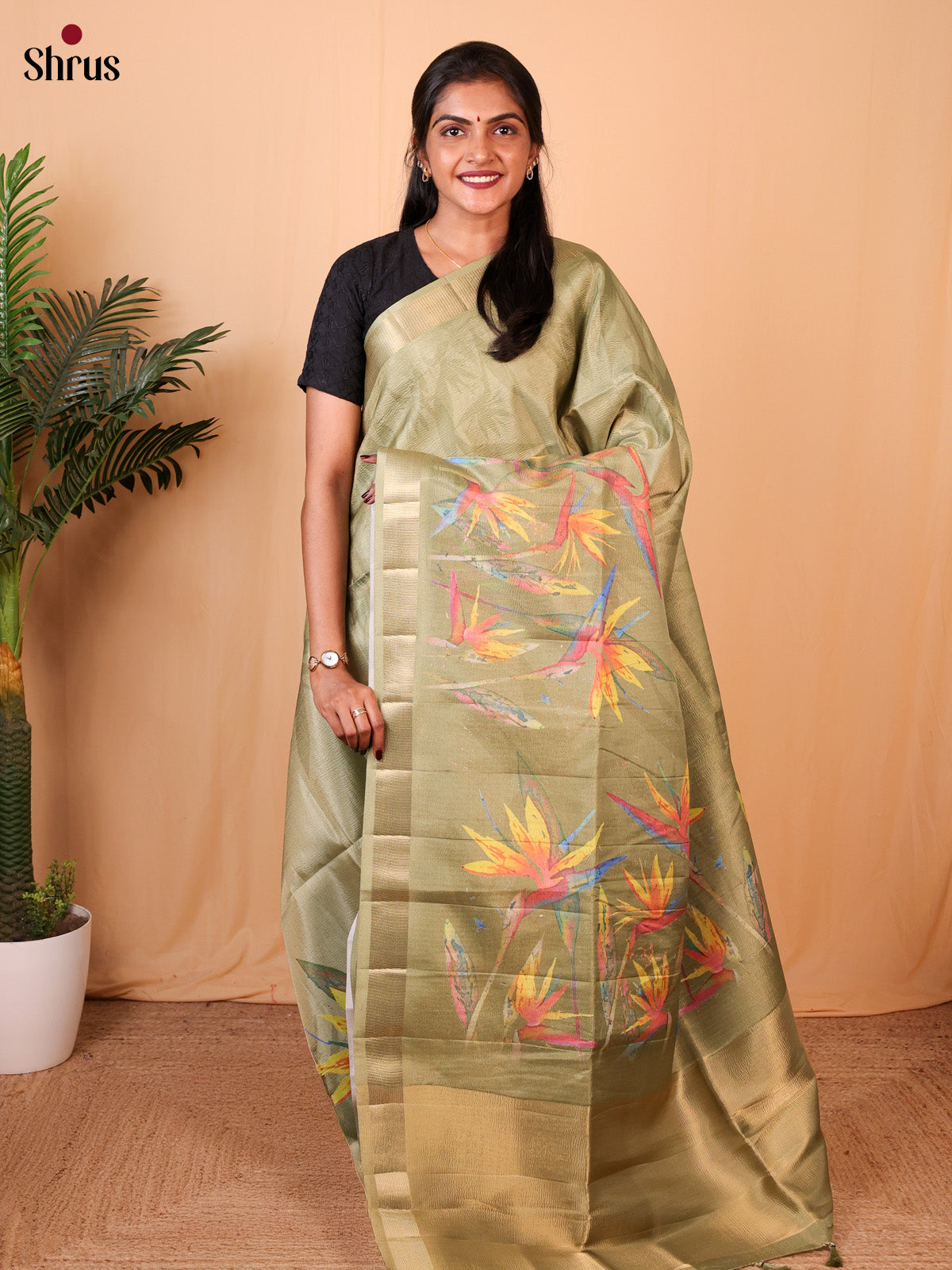 Elegant Green Bamboo Silk Saree enchants with digital floral print on the body. The self zari border and Pallu add a charming touch. An attached self printed blouse with border completes the ensemble..