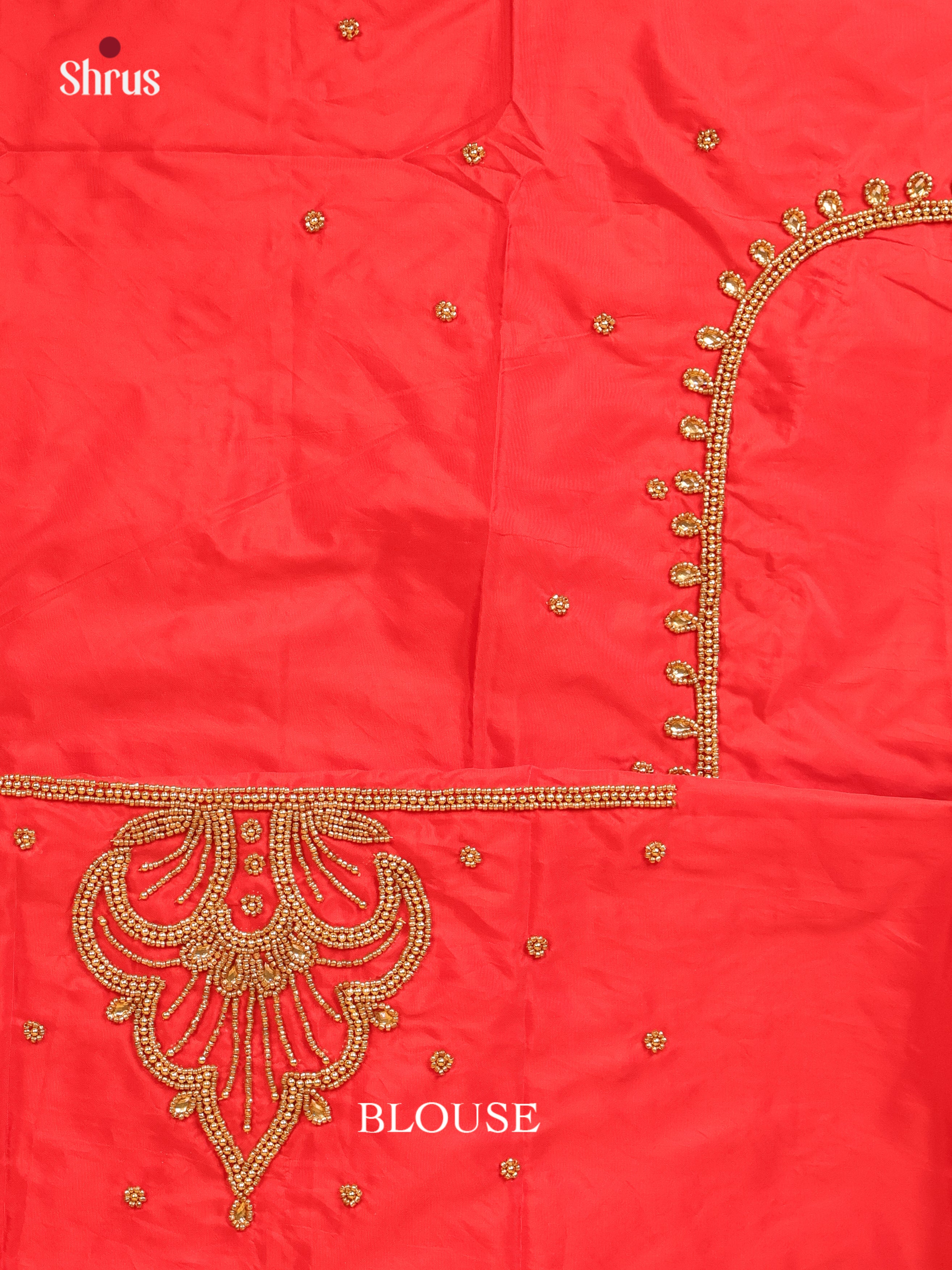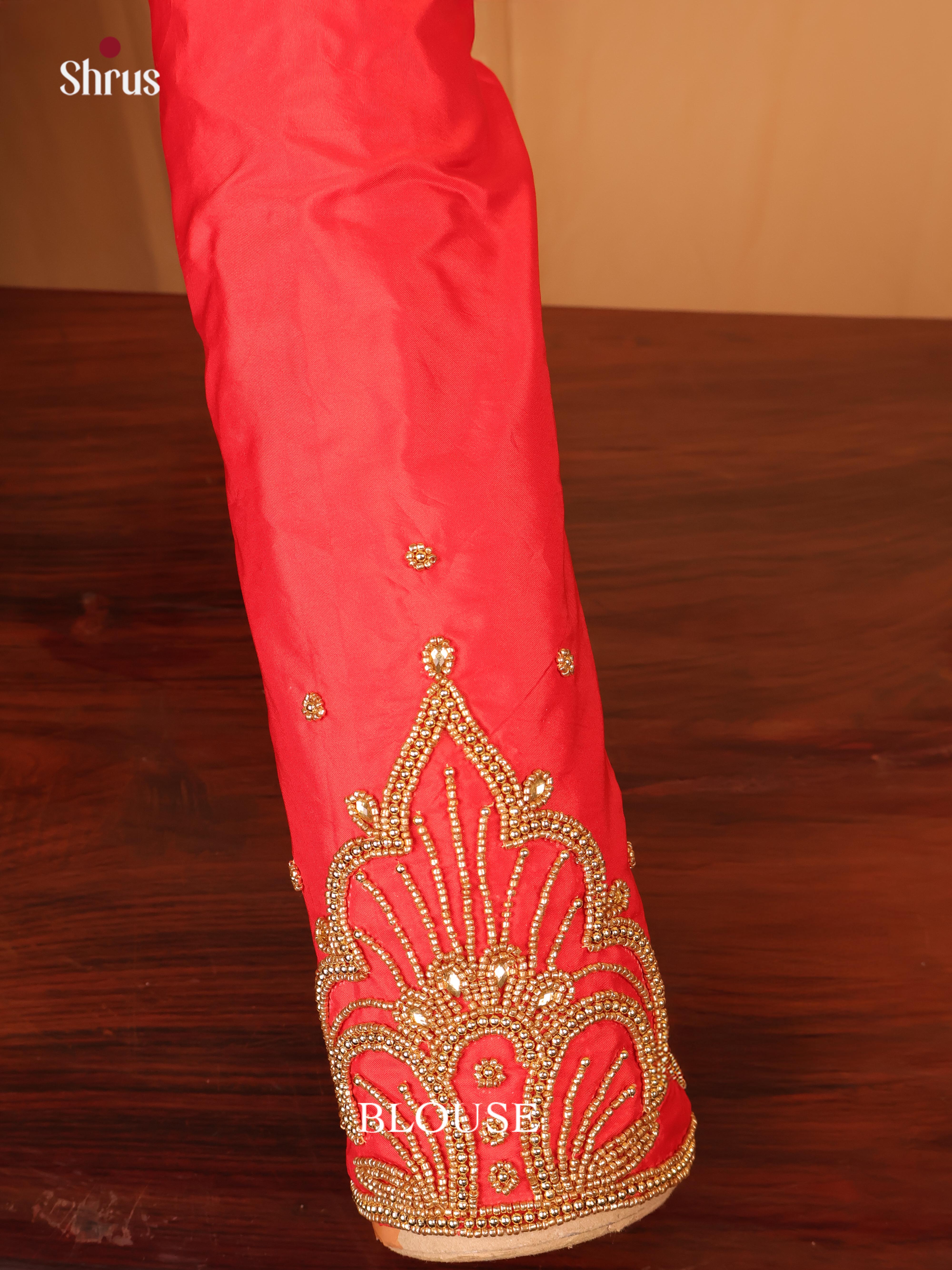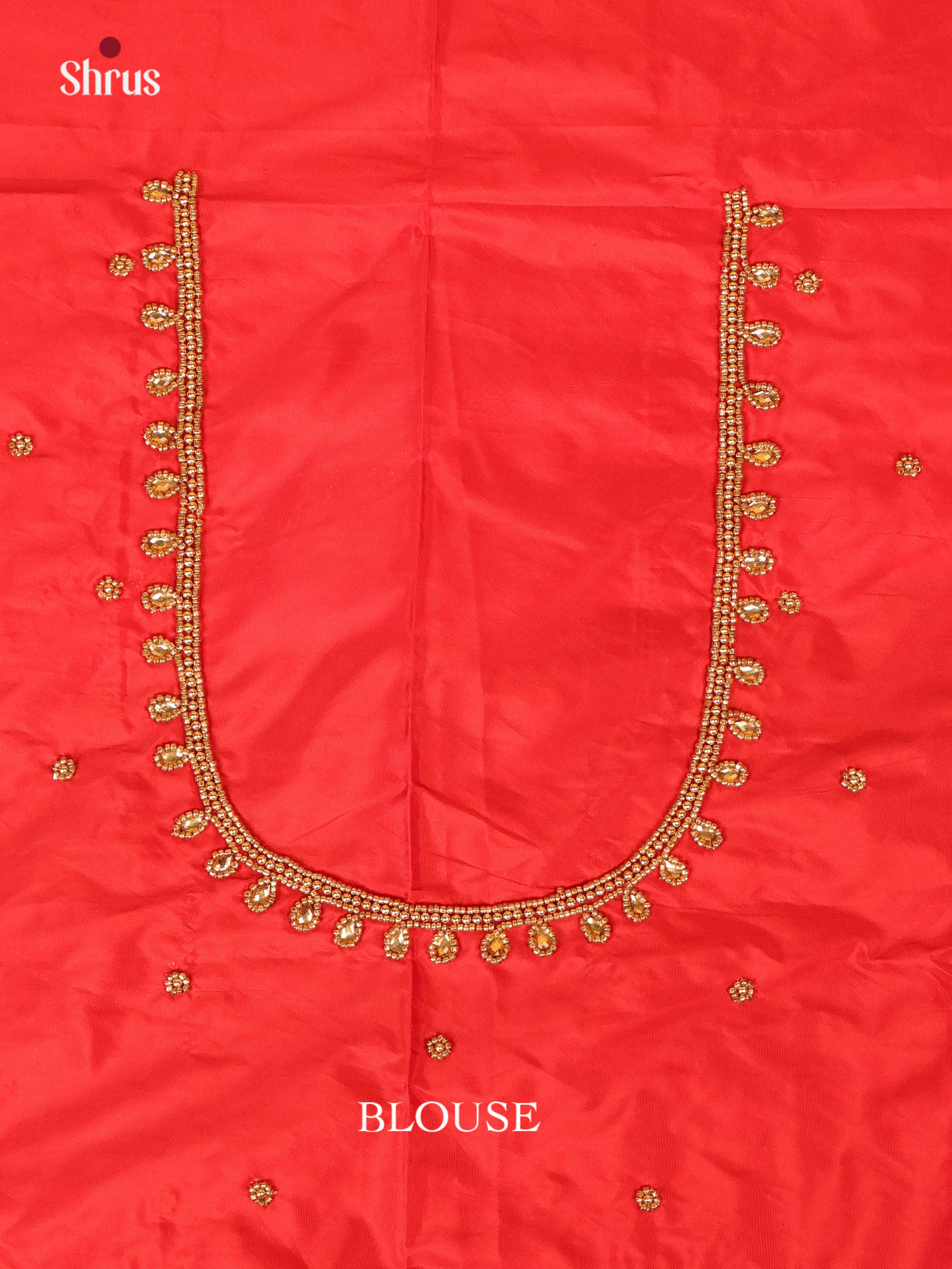 Pretty Red Aari Blouse beautifully features stunning stones and beads on the neck and sleeves. This garment perfectly blends traditional elements with premium fabric, creating a luxurious and durable piece that every fashion expert should own.