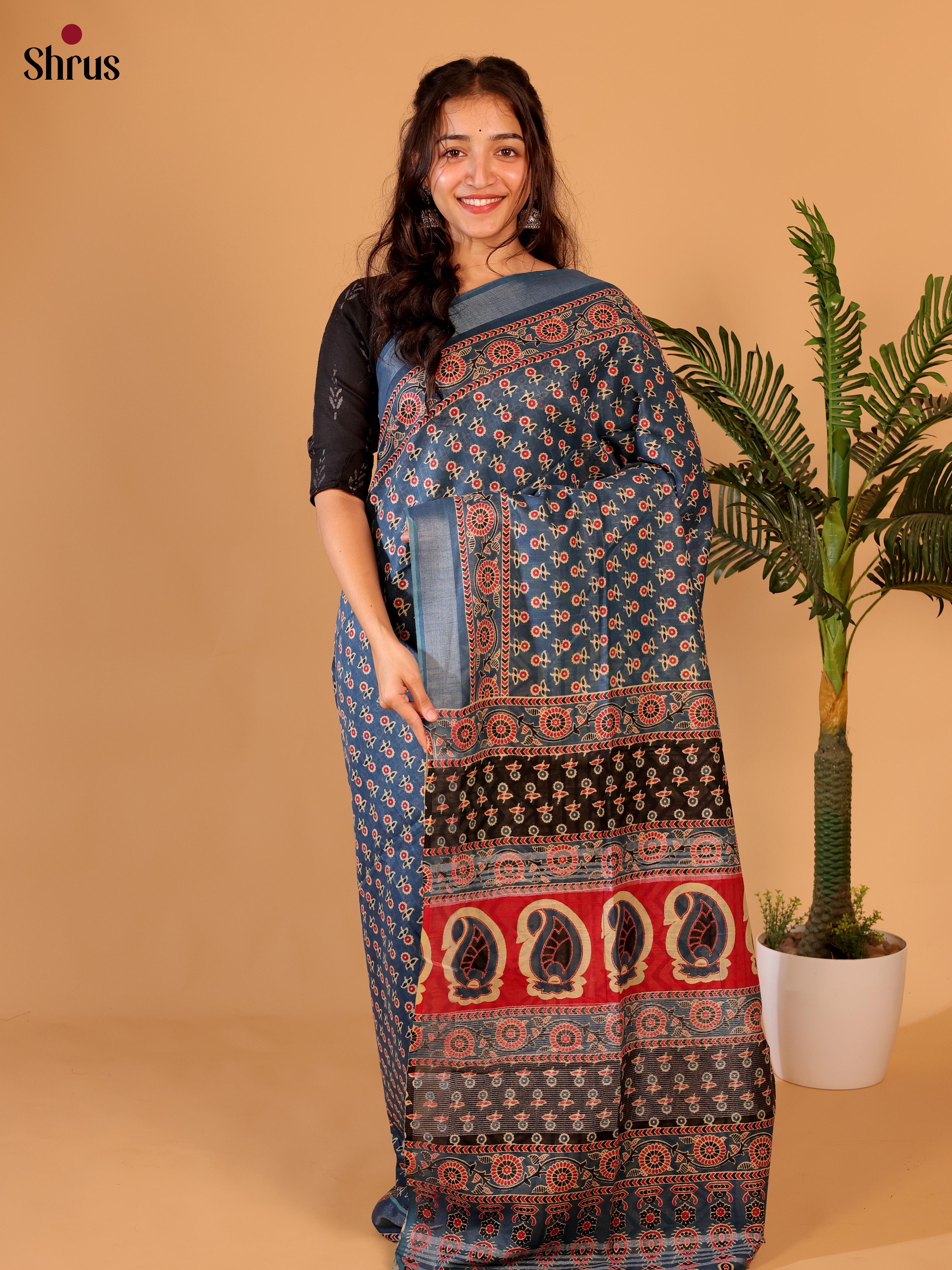Beautiful Blue Linen cotton saree with neatly printed floral design and zari border and combined with splendid printed pallu and contrast Printed Beige blouse with border