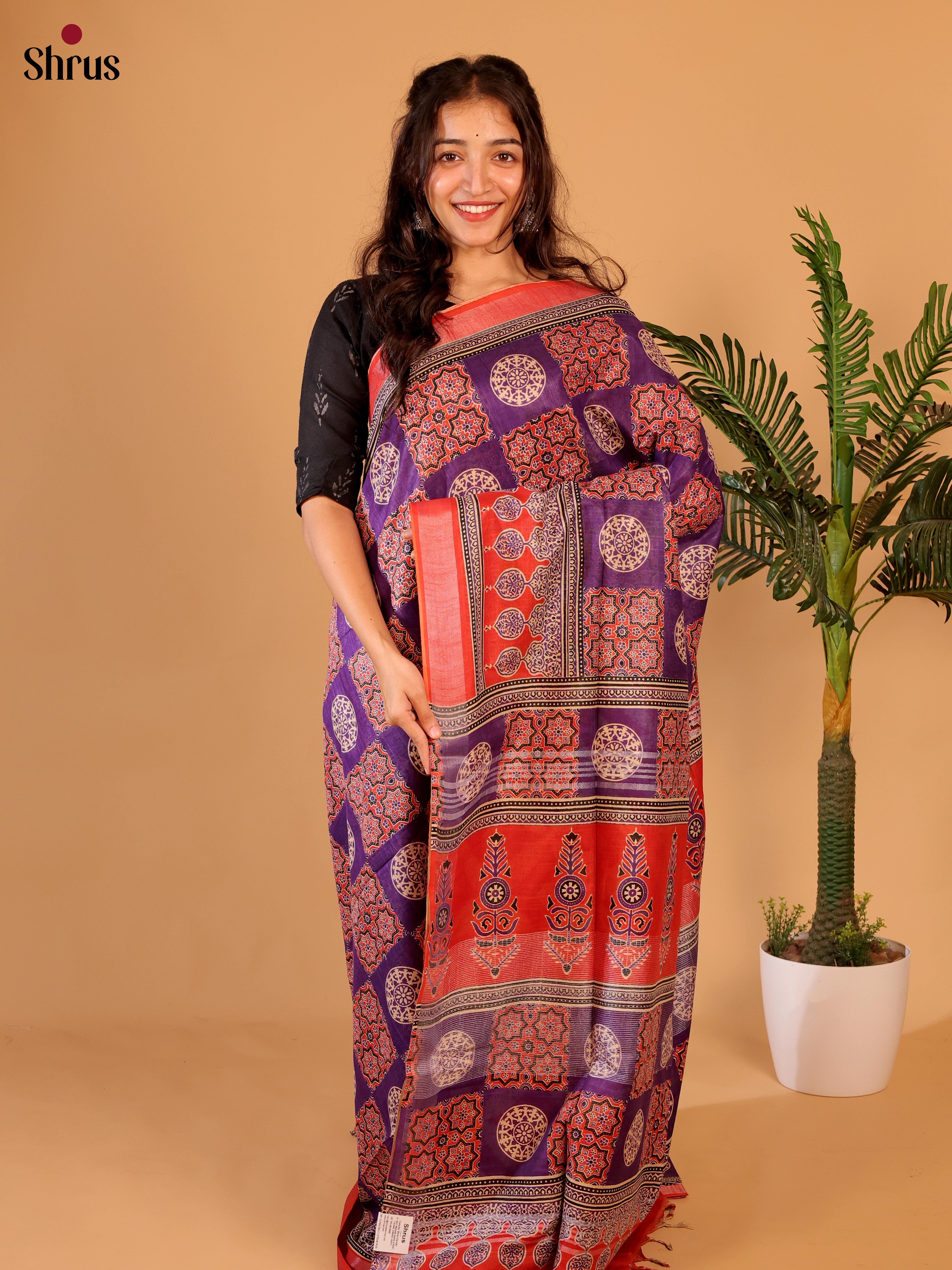 Beautiful Violet Linen cotton saree with neatly printed floral design and Red zari border and combined with splendid printed pallu and contrast Printed Red blouse with border