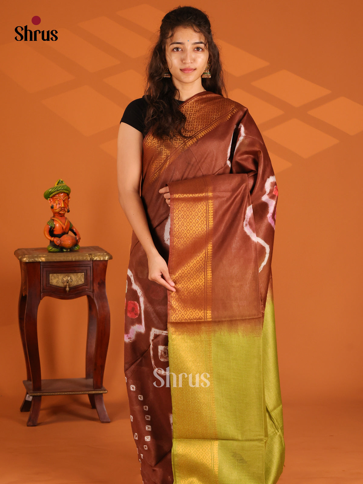 Elegant Brown Shibori Saree features a stunning shibori pattern on the body, complemented by a self zari border and a contrast Red zari striped pallu. It comes with a contrast plain blouse with a zari border to complete the ensemble.
