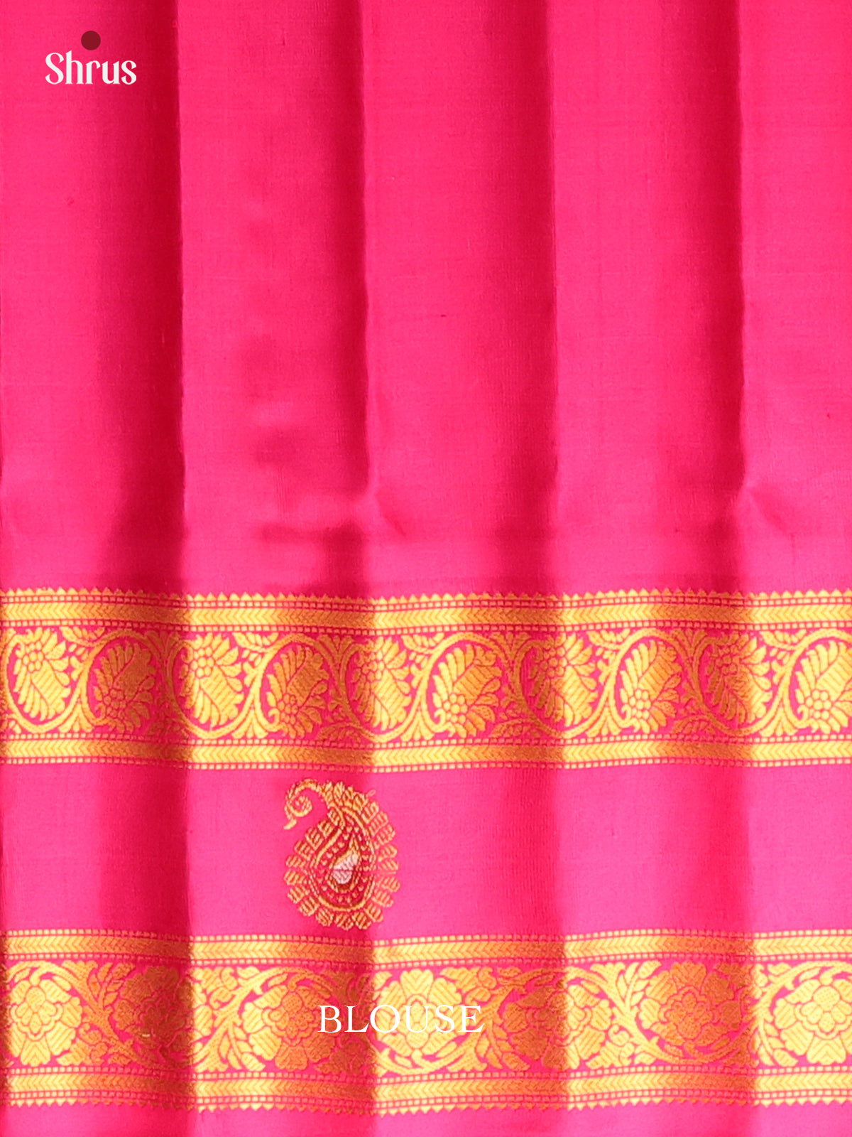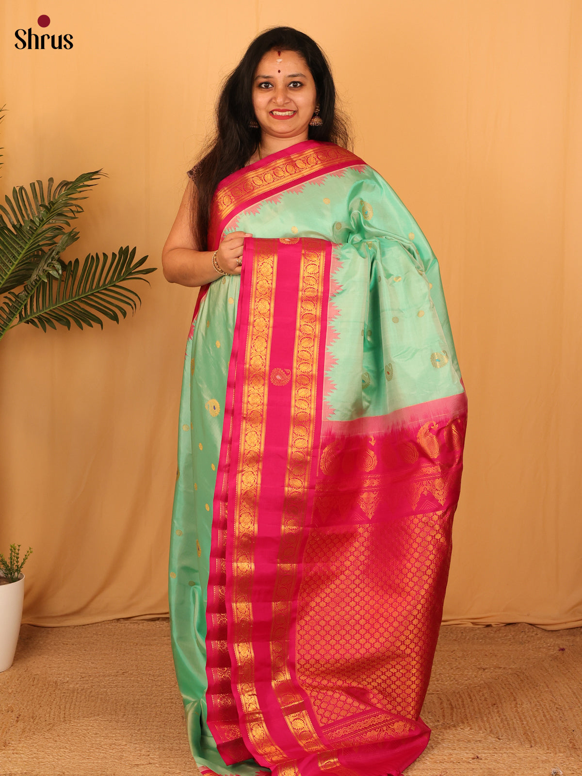 Elegant Pastel Green Gadwal pattu saree gleams with intricately woven gold zari floral buttas across the body. The saree is further accentuated by a contrast Pink zari border and a rich zari brocade pallu. A lovely contrast Pink plain blouse with zari border beautifully complements this ensemble.