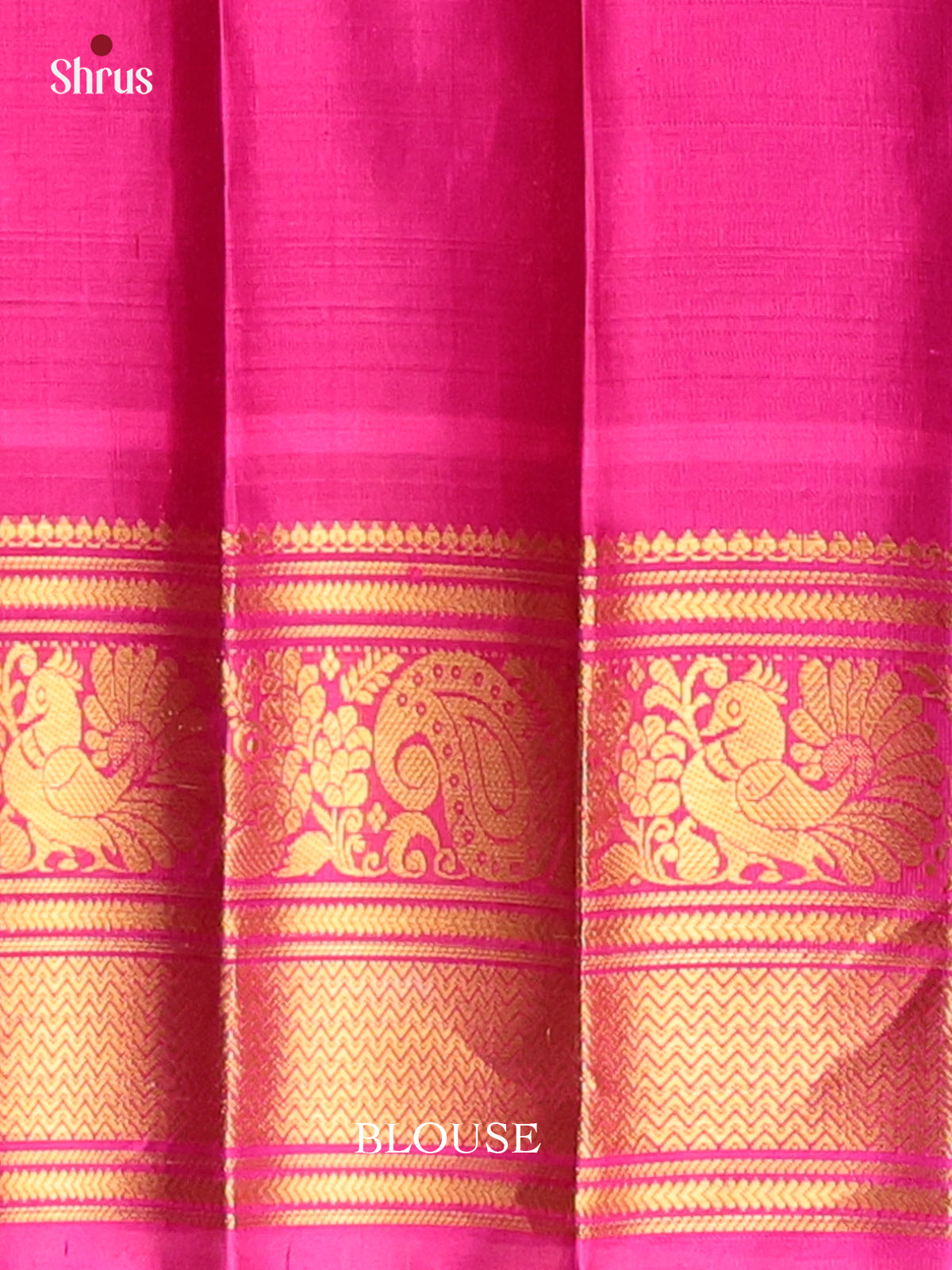 A Lustrous Lemon Yellow Gadwal pattu saree gleams with intricately woven gold zari buttas across the body. The saree is further accentuated by a contrast Magenta zari border and a rich zari brocade pallu. A lovely contrast Magenta plain blouse with zari border beautifully complements this ensemble.