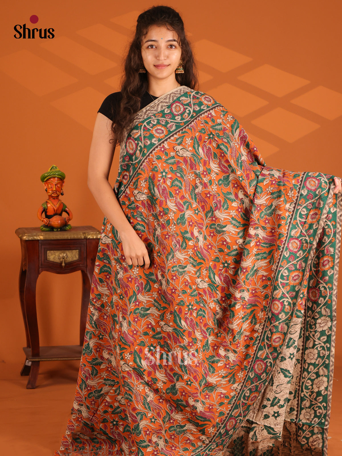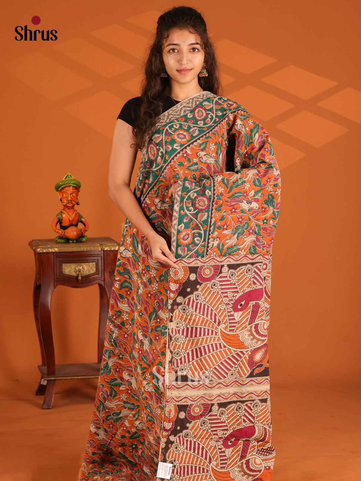 Pretty Orange kalamkari Cotton saree features a kalamkari floral print on the body and a printed border, enhanced by a contrast pallu for added elegance. The attached Cream kalamkari blouse provides a perfect fit.