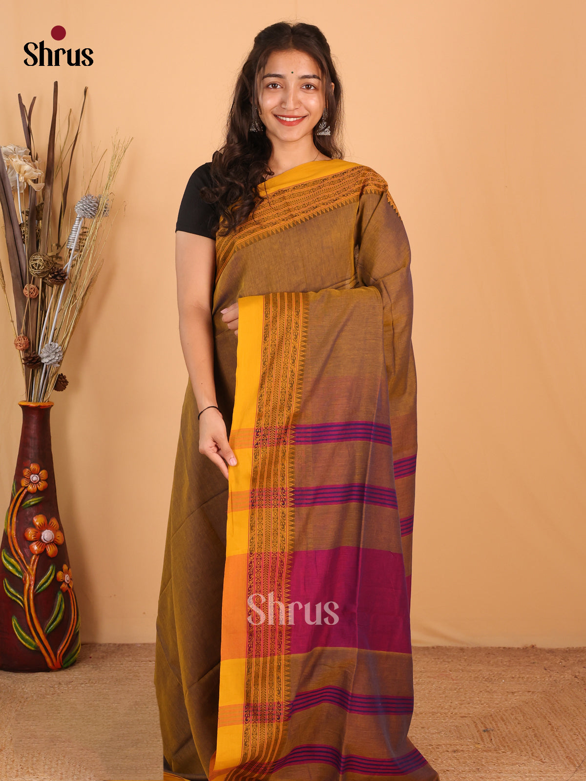 Pretty Double Shaded Green Bengal cotton Saree features plain body . The elegant contrast Purple woven border & pallu is paired with a simplistic, contrast Blouse with border.