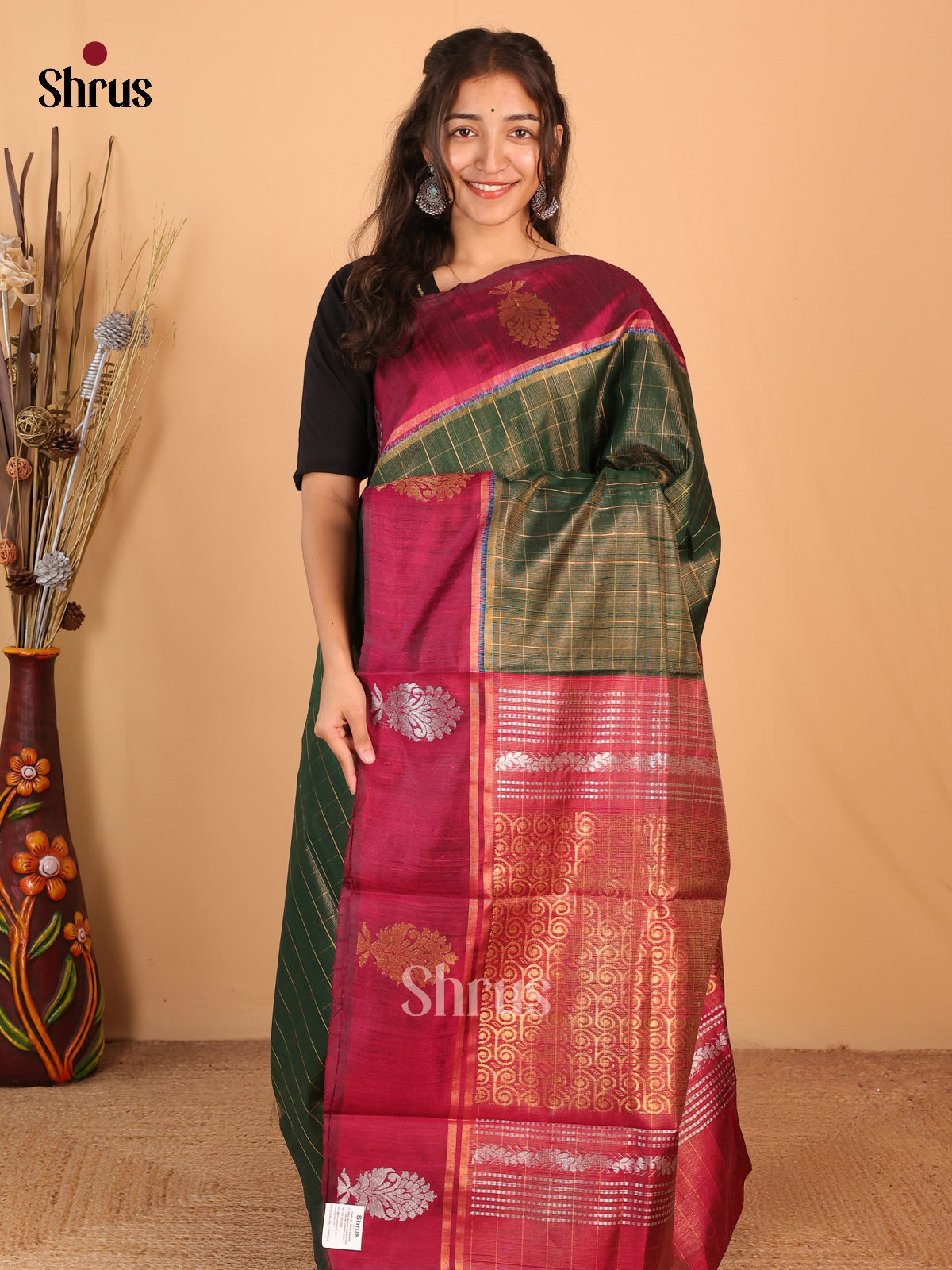 Classy Green Raw Silk Saree features zari checks on the body and a contrast Maroon Border that adds a touch of charm. The Maroon zari Pallu and zari striped Blouse with border give a chic and stylish twist to the overall design.