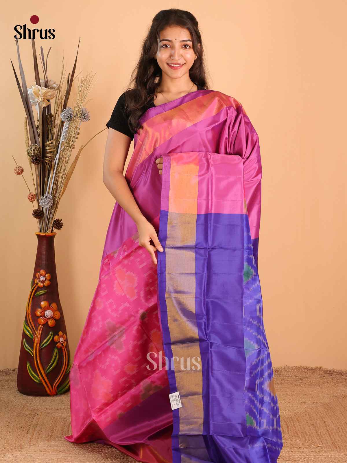 Elegant Pink Semi Uppada saree shimmers with intricate ikkat floral patterns with zari border looks aesthetically elegant . The contrast Violet floral woven Pallu & plain blouse with zari border gives a perfect finish