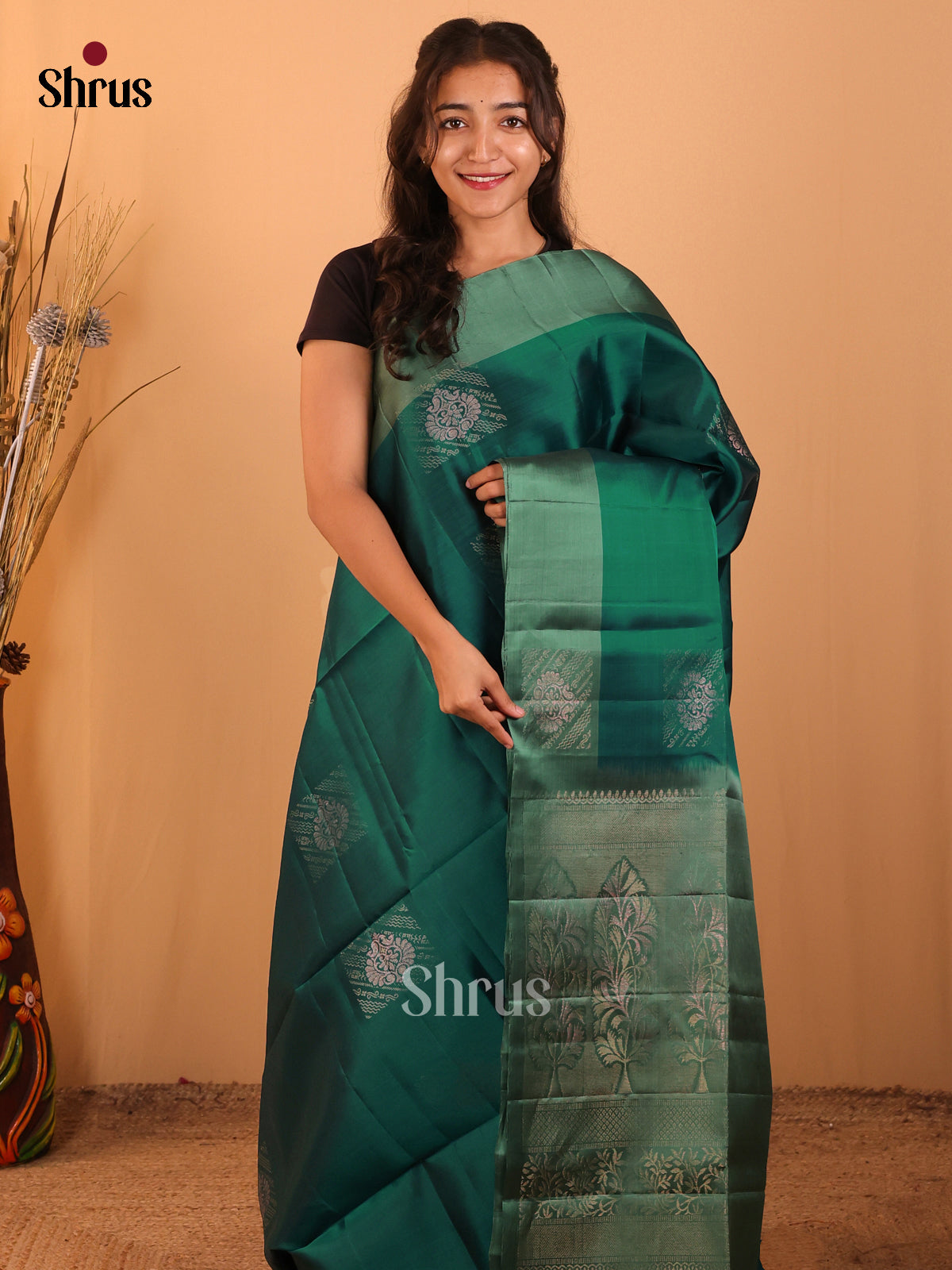 Classy Green Silk (Half Pure) Saree enchants with zari woven floral buttas on the body & bounded with contrast border gives a classy look .The Splendid contrast pallu with zari woven brocade & plain blouse lends compliments