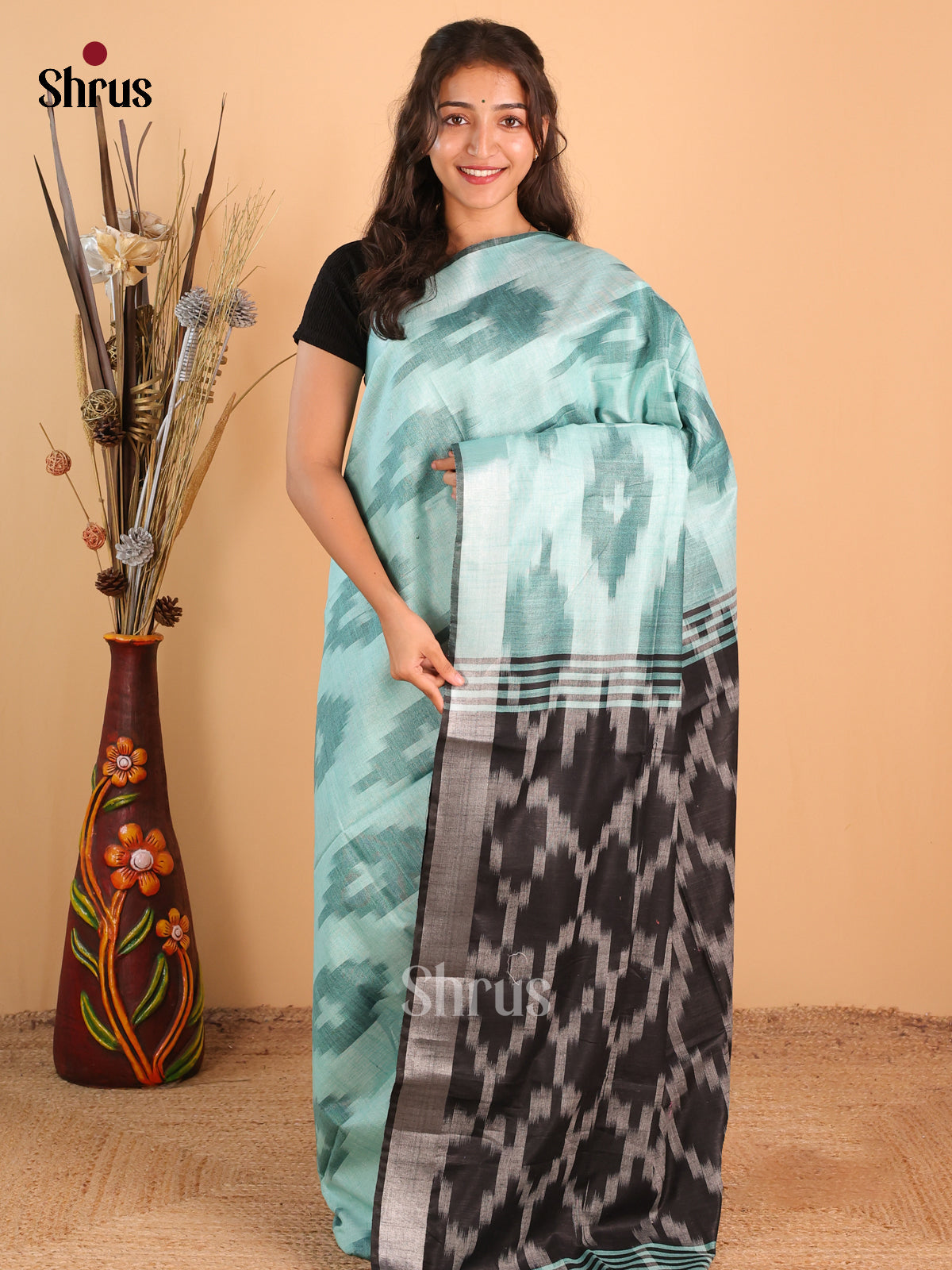 Elegant Pastel Green Semi Ikkat Saree features a thread woven ikkat buttas on the body and is accented with a contrast zari border. The saree is further enhanced by a contrasting Black ikkat woven pallu and blouse, creating a perfectly fitted look