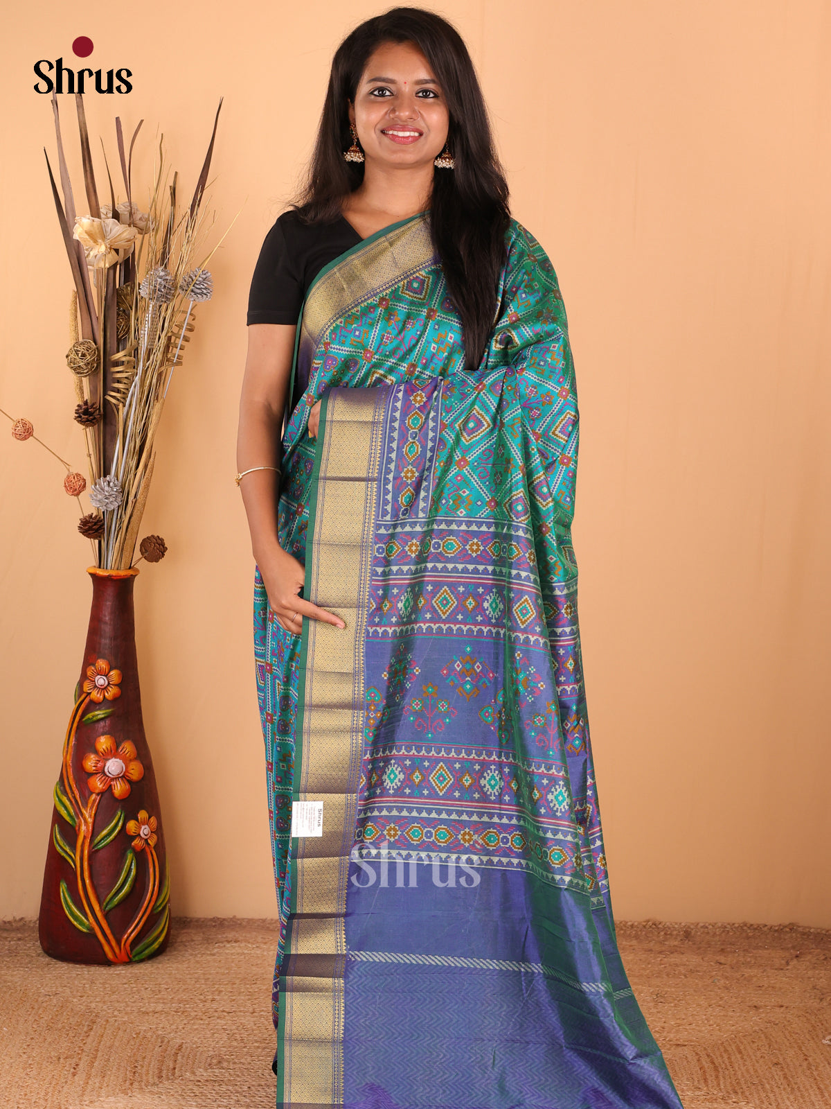 Elegant Green Semi Patola Saree features a stunning floral patola pattern printed on the body and complemented by a splendid Blue zari border. The saree comes with a contrasting Blue Pallu adorned with a floral print, as well as a blouse with a zari border.