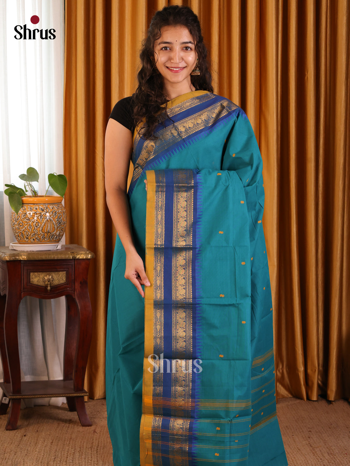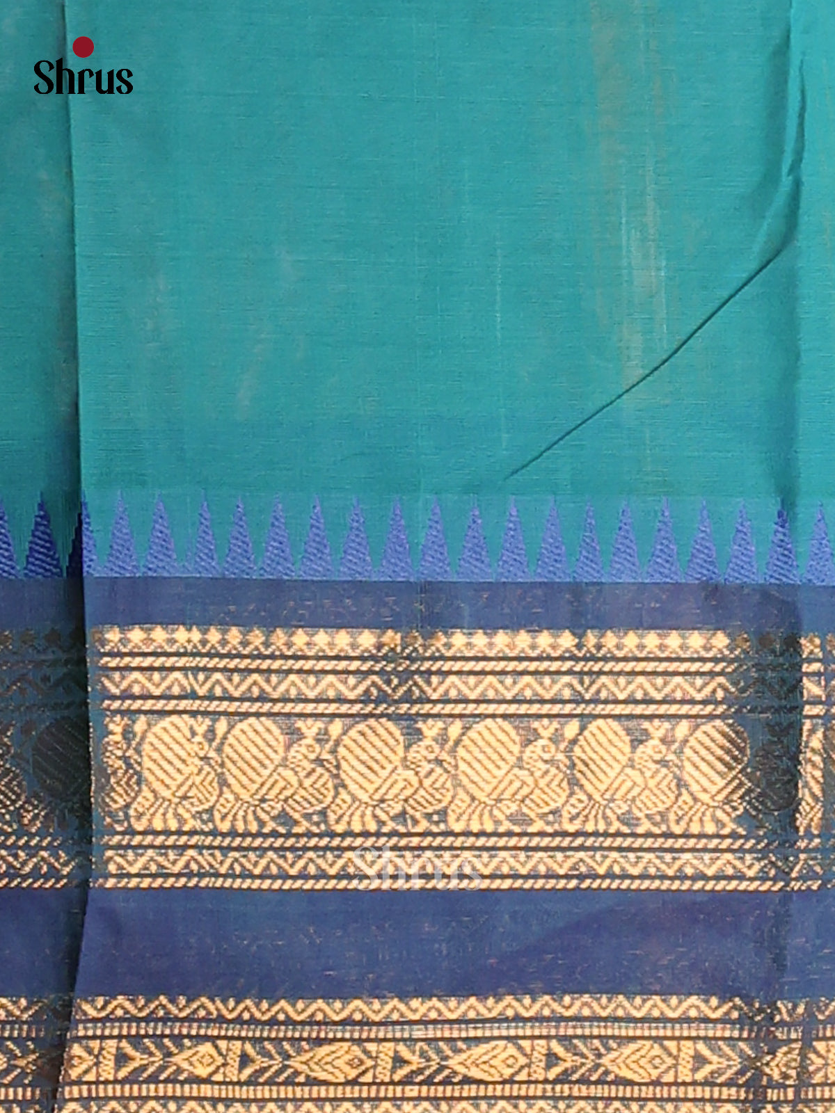 Elegant Teal Chettinad Cotton Saree with Blue Rettaipet Zari Border & Thread Buttas