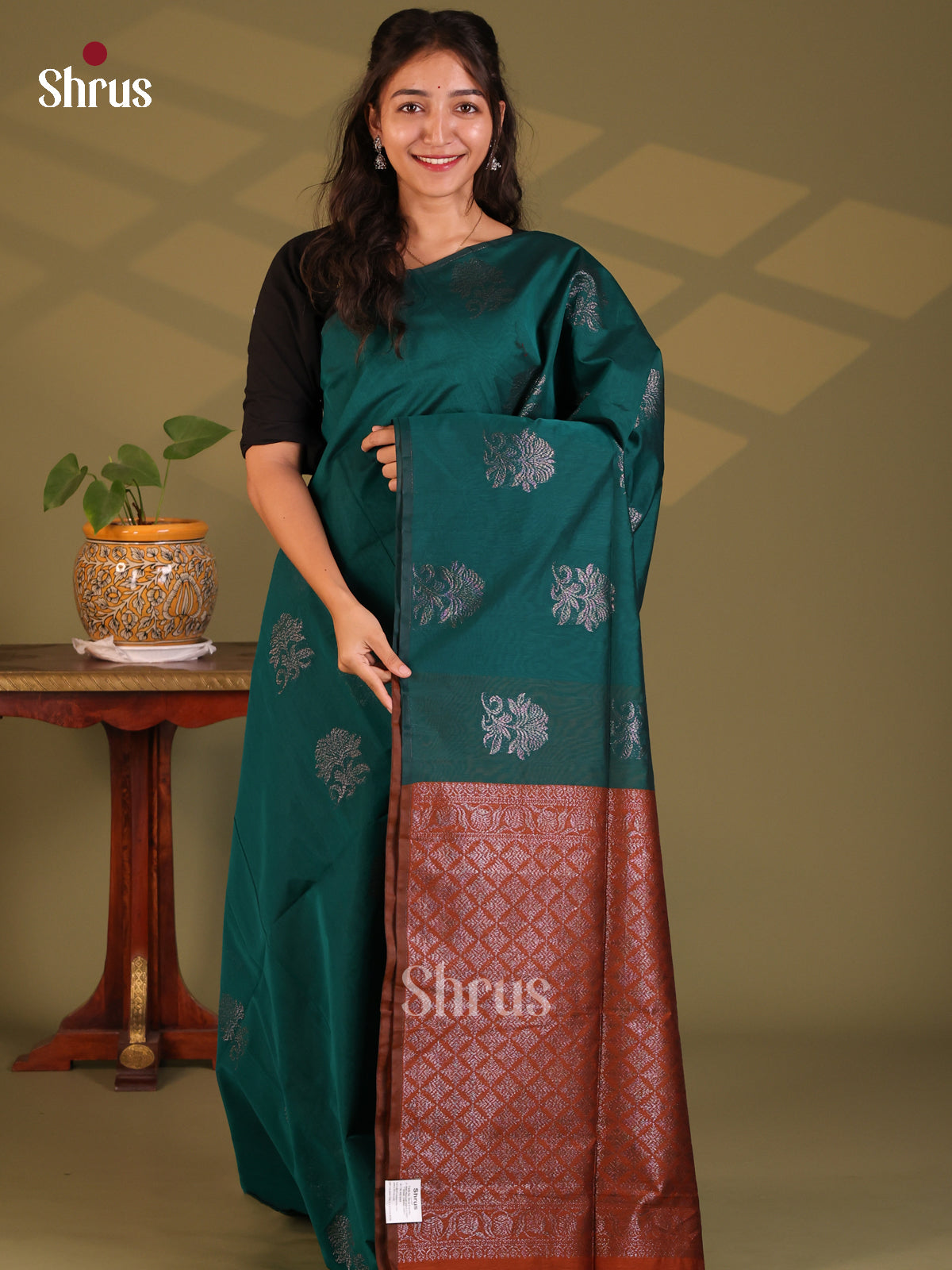 Dark Green with Brown - Semi Silkcotton Saree