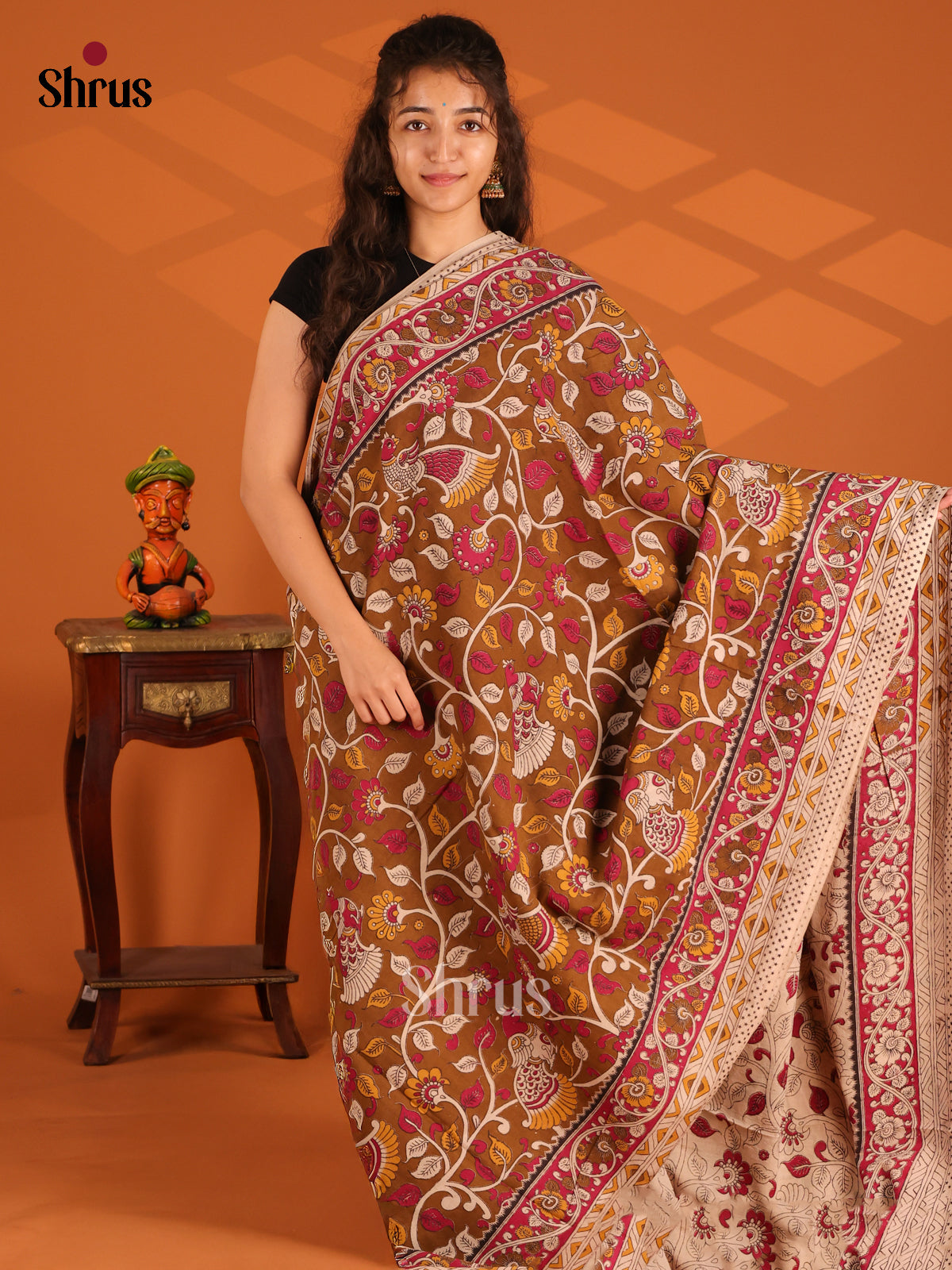 Pretty Brown kalamkari Cotton saree features a kalamkari floral, peacock print on the body and a printed border, enhanced by a peacock pallu for added elegance. The attached Cream printed blouse provides a perfect fit.