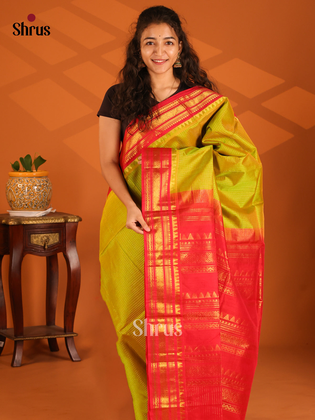 Mango Yellow & Red Silk Cotton Saree With Zari Woven Temple Border & Grand Pallu