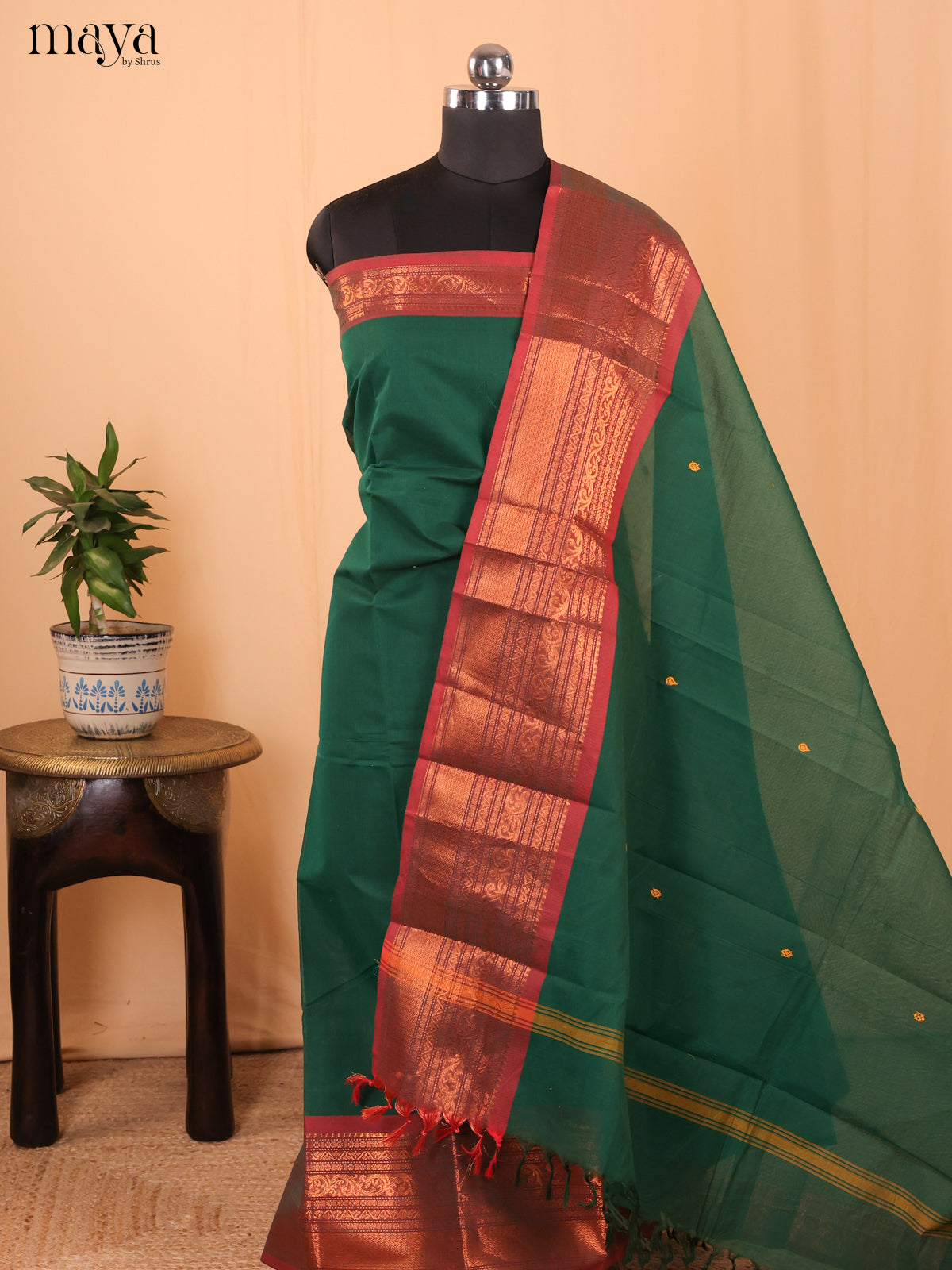 Green & Brown - Chettinad Cotton Unstitched Top & Dupatta -MDA24011