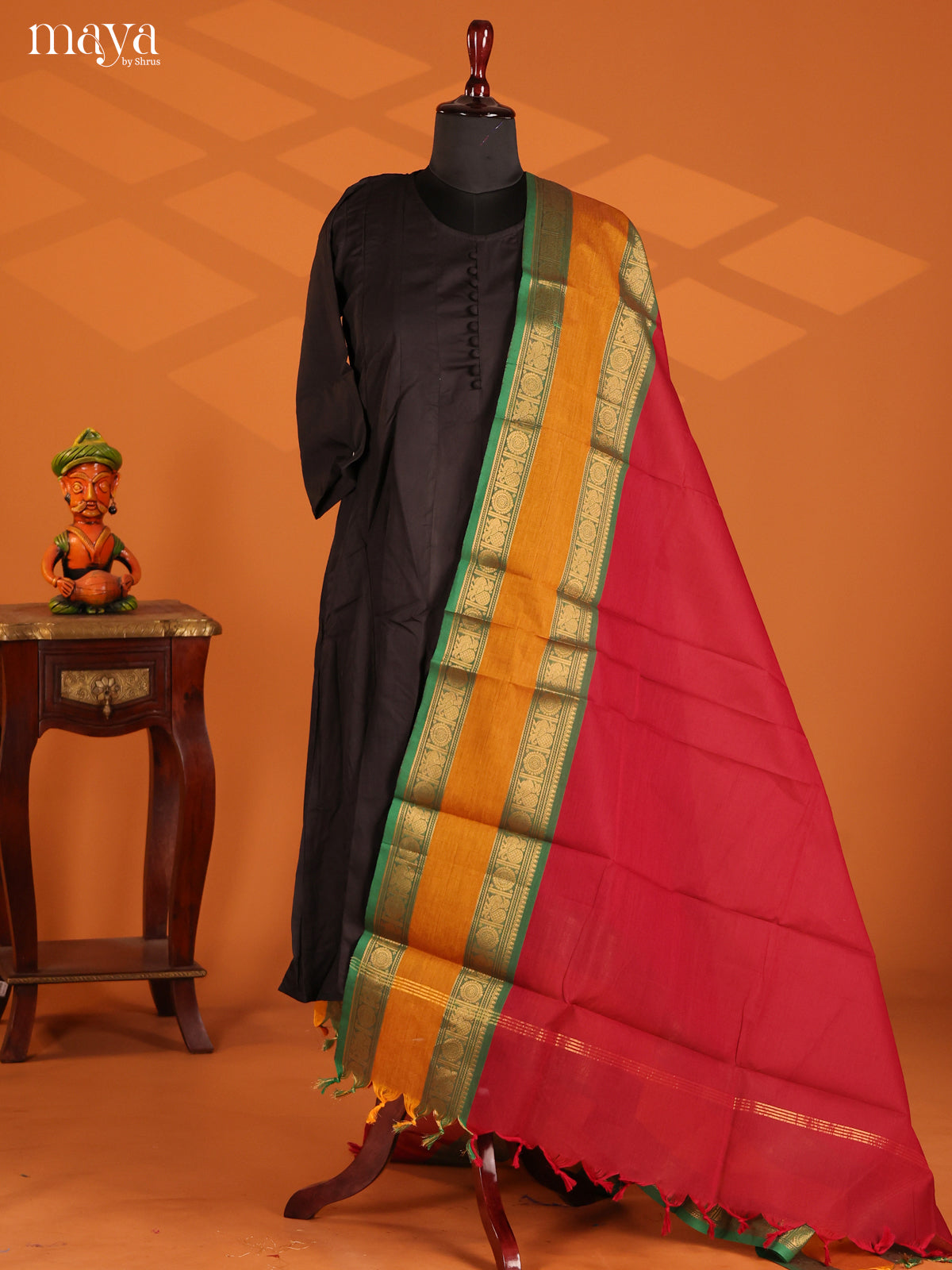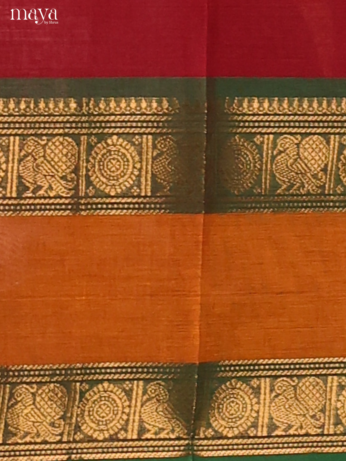 Pretty Red Chettinad Cotton Dupatta adorned with classic rettaipet green zari borders.