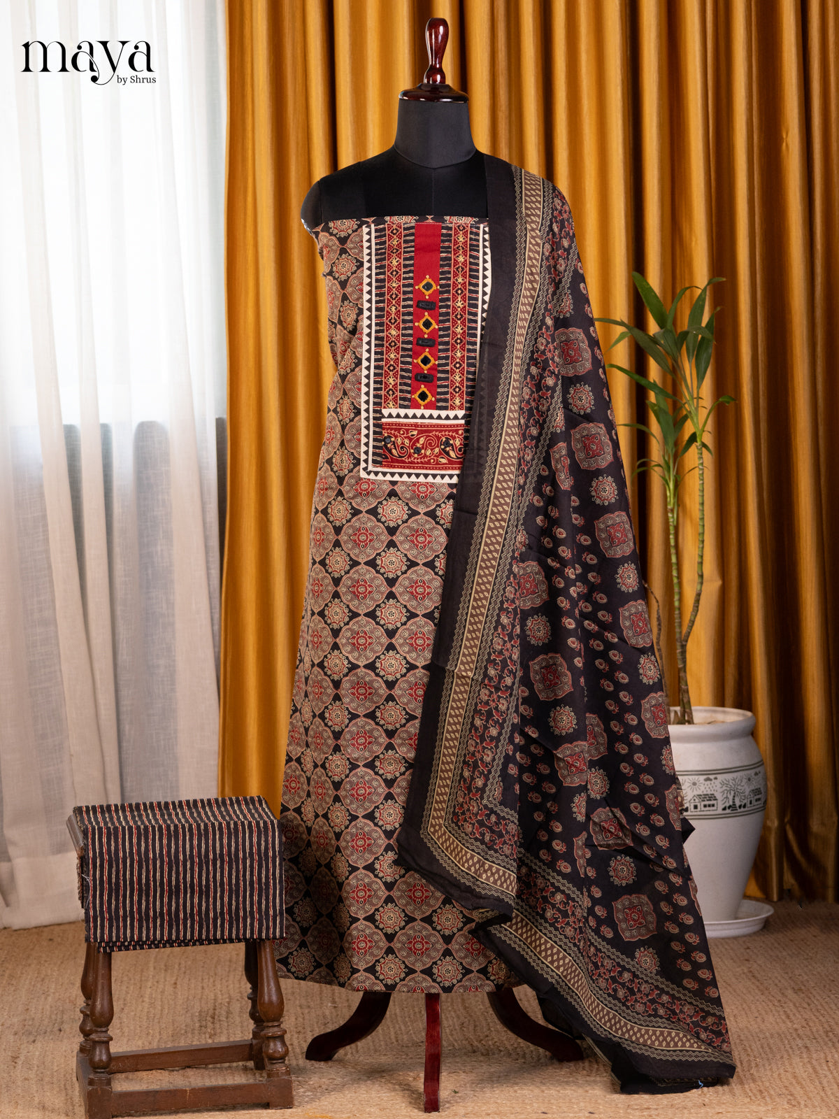 Pretty Black Ajrakh salwar adds a touch of beauty to any ensemble with its lovely floral print and complementary self bottom and dupatta. Made with high-quality cotton, this unstitched suit is perfect for any fashion-forward individual.