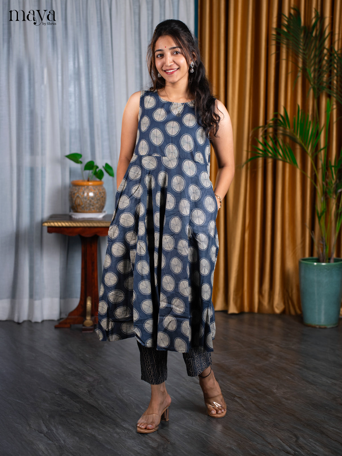 Navy Blue Cotton 2pc Block Print Salwar Suit - Top & Bottom