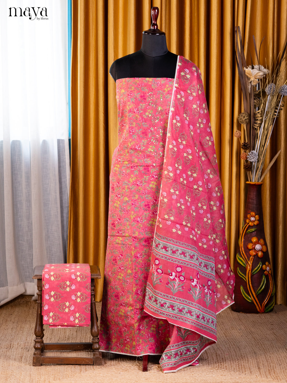 Charming Pink Cotton salwar adds a touch of beauty to any ensemble with its lovely floral print and complementary self bottom and dupatta. Made with high-quality cotton, this unstitched suit is perfect for any fashion-forward individual