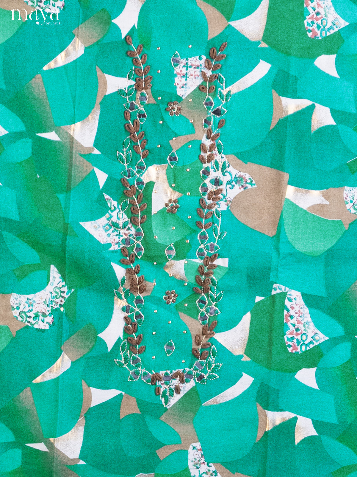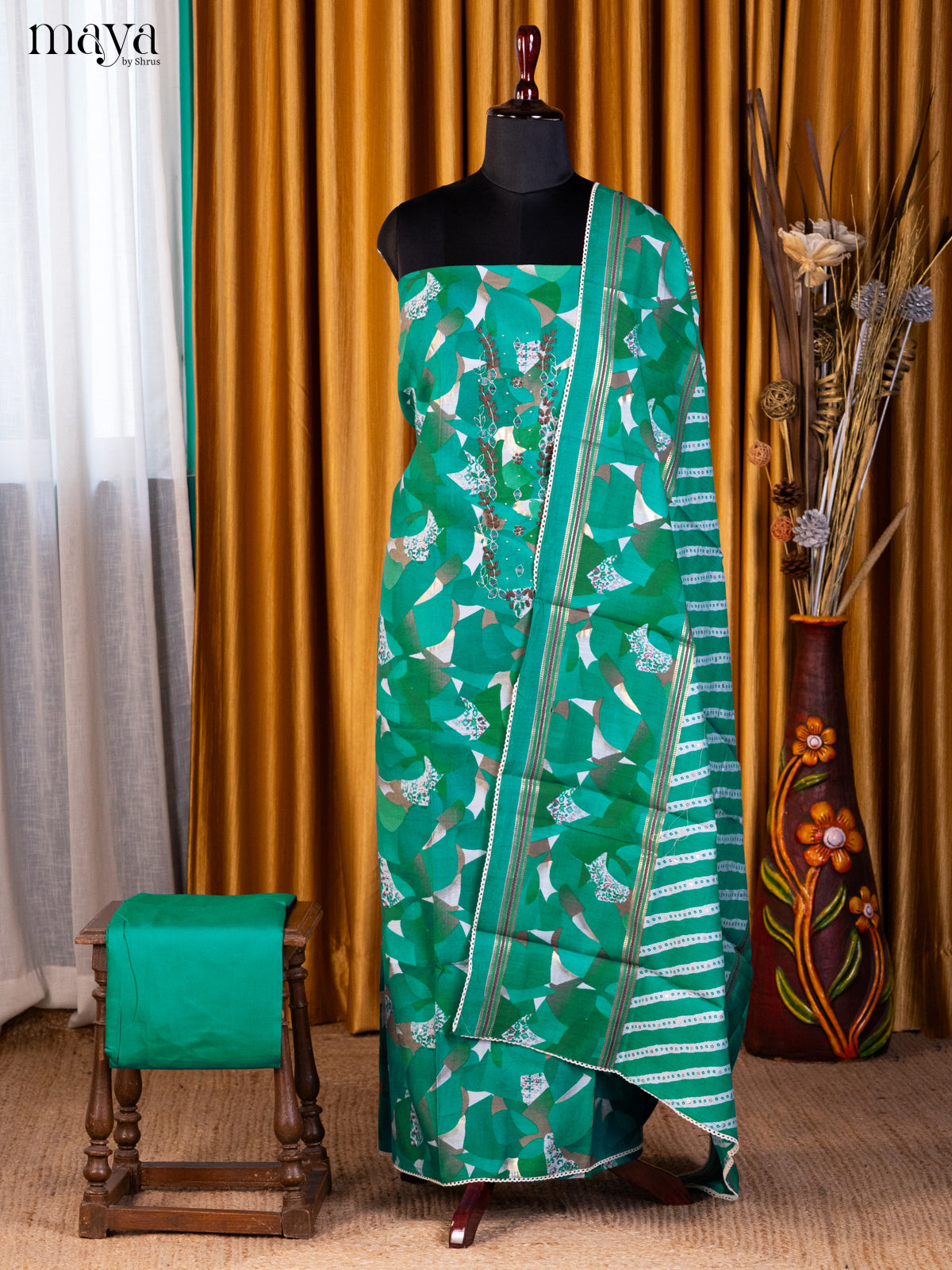Elegant Green Cotton salwar adds a touch of beauty to any ensemble with its lovely floral print and complementary self bottom and dupatta. Made with high-quality cotton, this unstitched suit is perfect for any fashion-forward individual