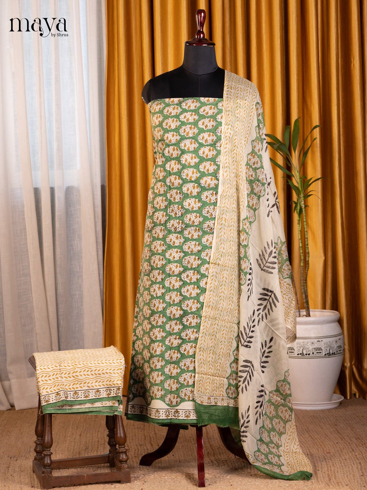 Pretty Green Cotton salwar adds a touch of beauty to any ensemble with its lovely floral print and complementary Cream bottom and dupatta. Made with high-quality cotton, this unstitched suit is perfect for any fashion-forward individual