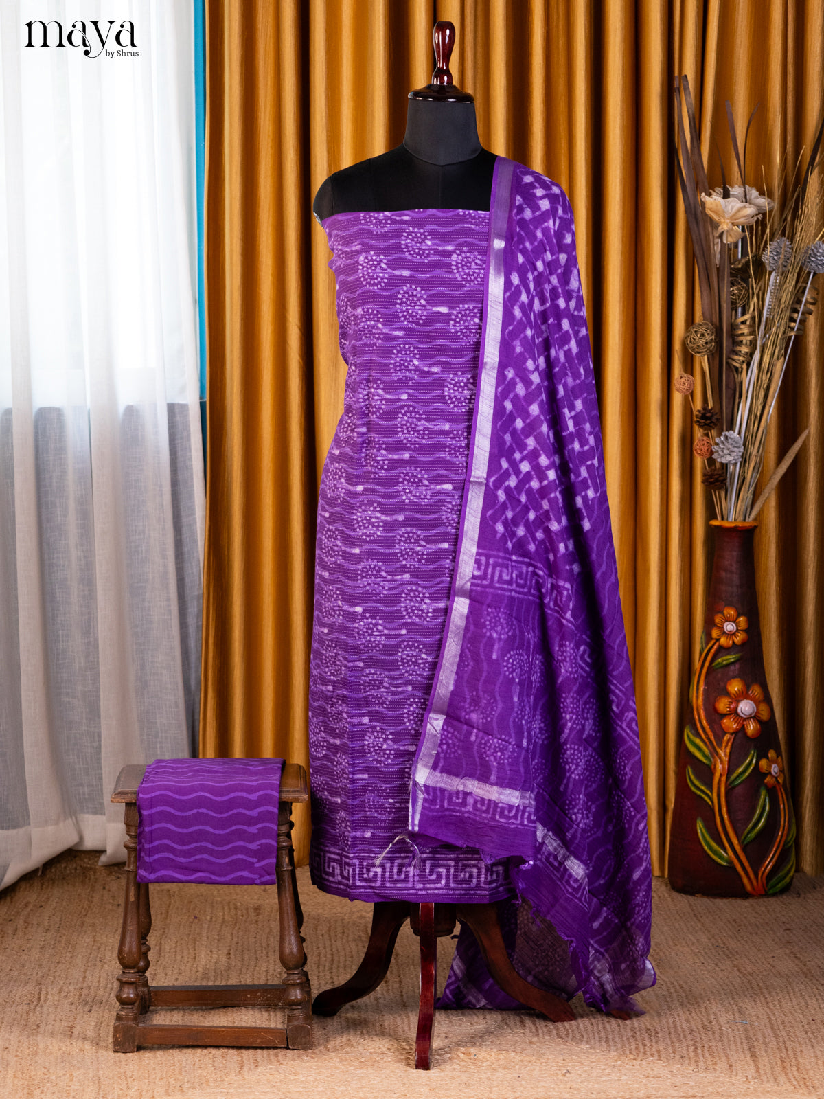 Pretty Violet Cotton salwar adds a touch of beauty to any ensemble with its lovely floral print and complementary self bottom and dupatta. Made with high-quality cotton, this unstitched suit is perfect for any fashion-forward individual