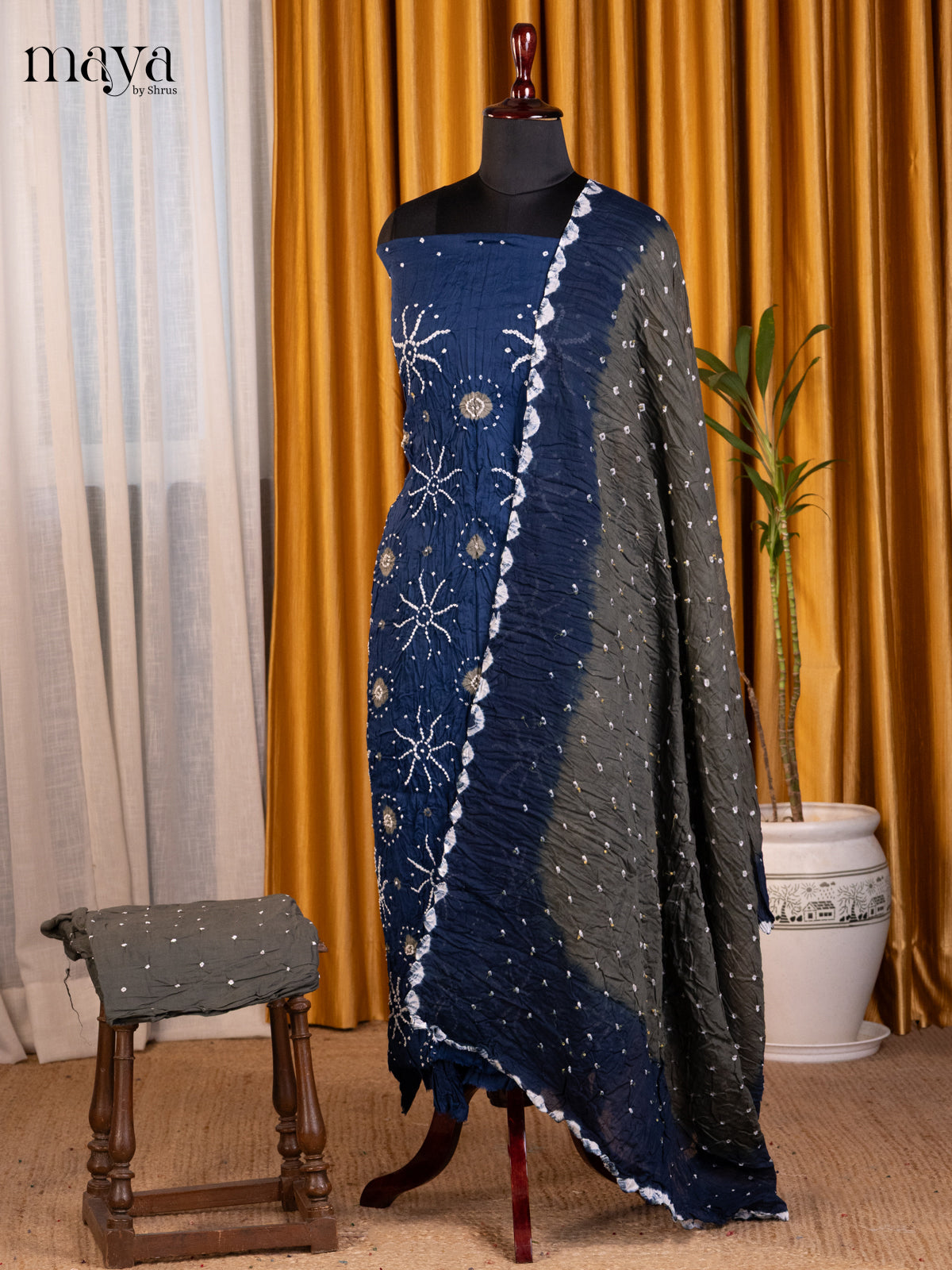 Elegant Blue Bandhini Unstiched salwar is truly beautiful, featuring Bandhini pattern on the top. The suit is paired with a lovely contrast Grey bottom and dupatta, completing the ensemble in a stylish and sophisticated manner